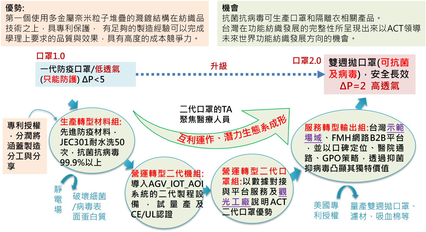 為加值防疫產業,以獨創抗病毒/細菌二代口罩,其抑菌力透過日本SEK檢驗認證驗證,抑菌率達到99%以上,為全球獨特含有銀銅鈦三種金屬合而為一的濺鍍抑菌抑病毒技術。目標客群聚焦醫療人員,串聯成員廠商及非營利組織,並以產業學院、示範場域及觀光工廠等3個服務轉型發展框架,強化跨業專利授權、跨域合作及設計體驗等服務,由需求端驅動生產端或供應端的生產轉型商模,協助防疫產業建立新生產、營運、服務模式型塑,以智慧創新驅動之產業新業態,打造材料、二代設備及二代口罩互利共榮的潛力生態系。