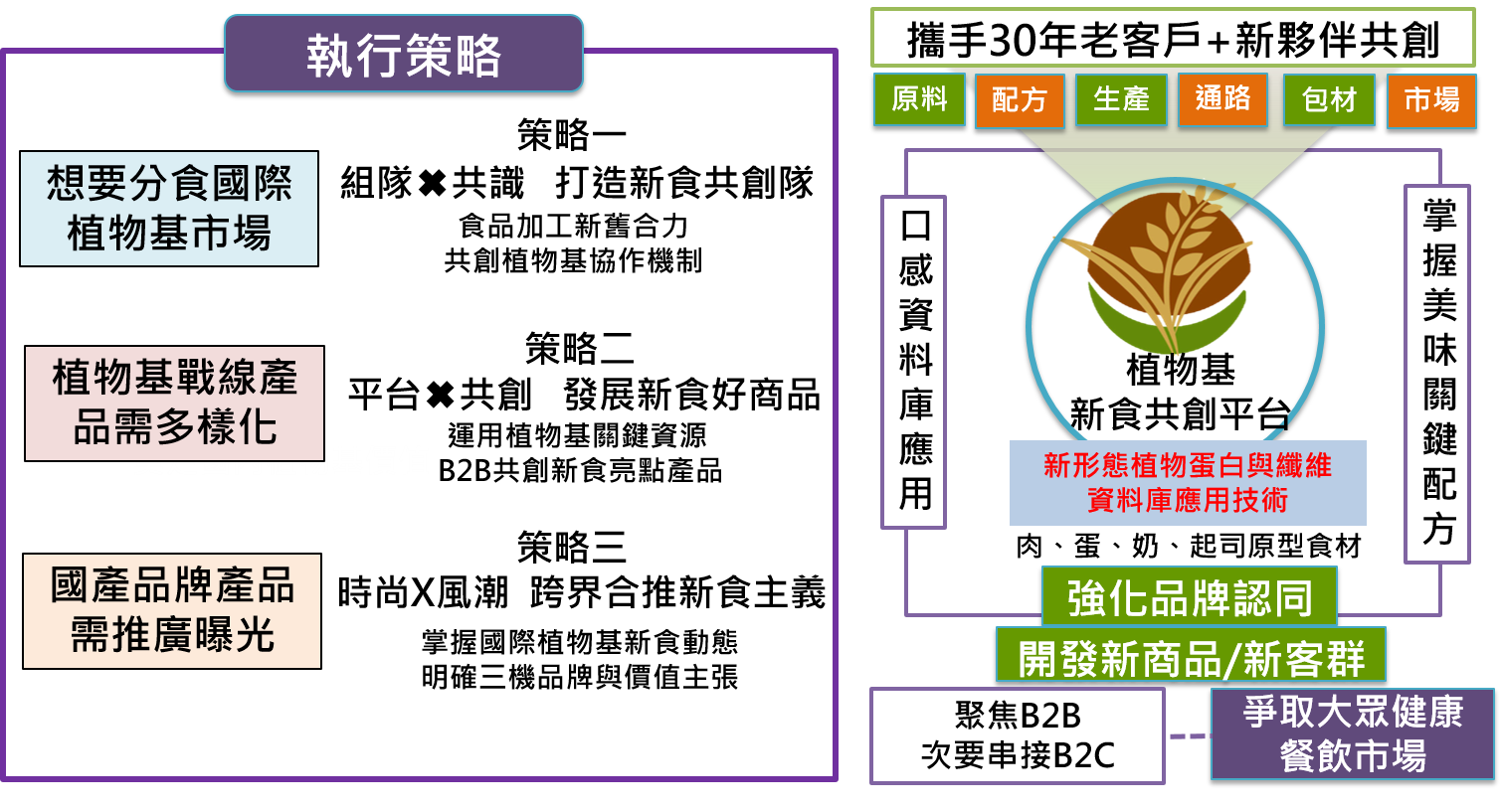 掌握國際植物基市場成長商機,運用國內五榖食品供應商既有營運模式,鏈結老客戶與新夥伴,共創植物基新食團隊,導入關鍵技術,開發多元植物基新產品,打響國產植物基品牌,拓銷國際市場。