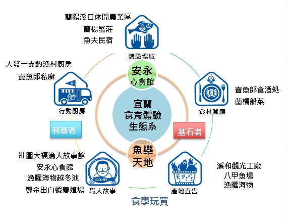 推動概述:串連宜蘭縣濱臨太平洋海岸之在地業者,發展食學玩買知識見學體驗模組、體驗服務據點、串連食育主題意象,成為兼具安心食材與知識體驗之食育體驗區,帶動區域經濟。