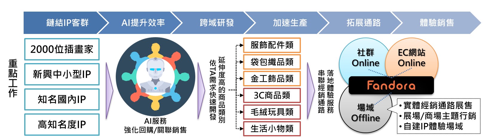 推動概述:串連IP品牌商的社群能量,運用AI技術深耕線上粉絲、擴大影響力;並進行IP品牌與IP製造源的多元跨域媒合,擴大生產能量;並拓展落地體驗服務,新闢粉絲接觸點以提升黏性,為IP消費市場創造更大利益