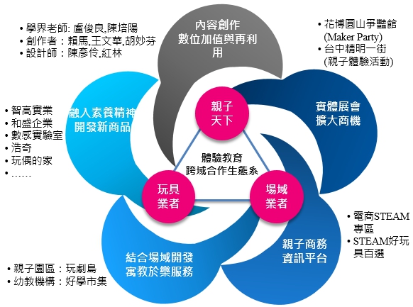 推動概述:串連內容出版業者、玩具業者、場域業者,將新課綱素養精神融入玩具製造及親子娛樂,填補STEAM商品多為國外引進缺口,發展可獲利、寓教於樂的商品與服務,進而促進家長與小朋友一起共學、共玩、共遊,增進親子情感