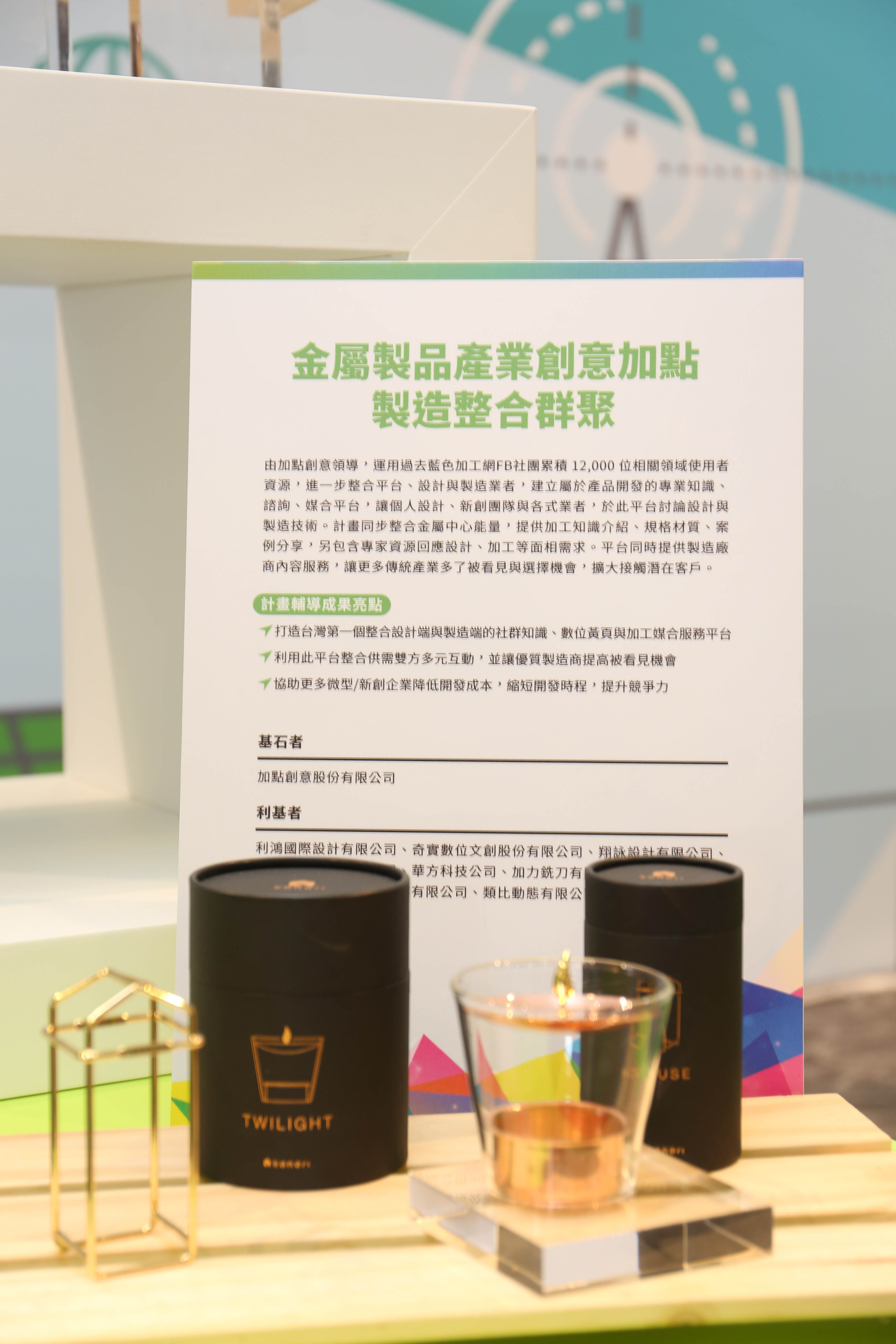 •類型:製造型服務化群聚 •窗口:金屬工業研究發展中心 簡介:由加點創意領導,運用過去藍色加工網FB社團累積 12,000 位相關領域使用者資源,進一步整合平台、設計與製造業者,建立屬於產品開發的專業知識、諮詢、媒合平台,讓個人設計、新創團隊與各式業者,於此平台討論設計與製造技術。計畫同步整合金屬中心能量,提供加工知識介紹、規格材質、案例分享,另包含專家資源回應設計、加工等面相需求。平台同時提供製造廠商內容服務,讓更多傳統產業多了被看見與選擇機會,擴大接觸潛在客戶。 代表廠商:加點創意
