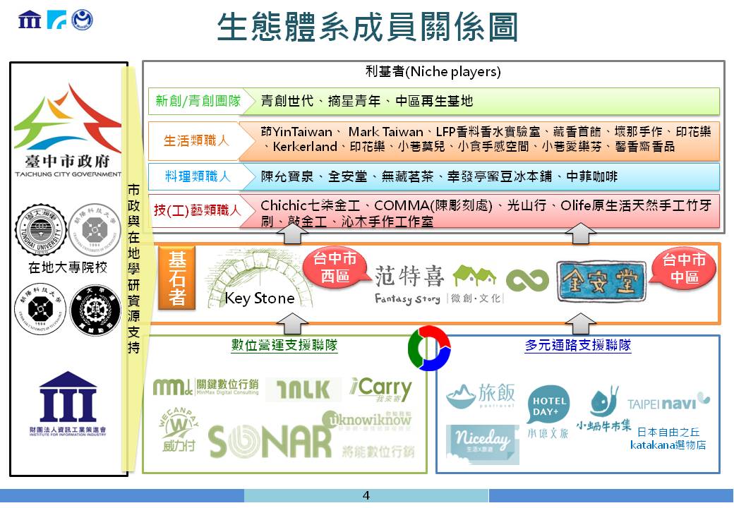 簡介:因應台中市政府發展政策,本計畫推動生活風格體驗經濟生態系,並由范特喜微創文化(西區)及全安堂太陽餅博物館(中區)為基石者,串連產官學研資源,運用青年創意、數位科技,以帶動台中在地生活類、料理類、工(技)藝類3大類職人之中小企業發展,共同建立具生活風格的體驗經濟,攜手邁向「生活首都、創意城市」願景。本計畫團隊分別提出:1.共同培育跨域創新人才、2.推動跨業與創意合作創新、3.建立開放式參與實證機制、4.促進市場通路最適化等四項推動策略。