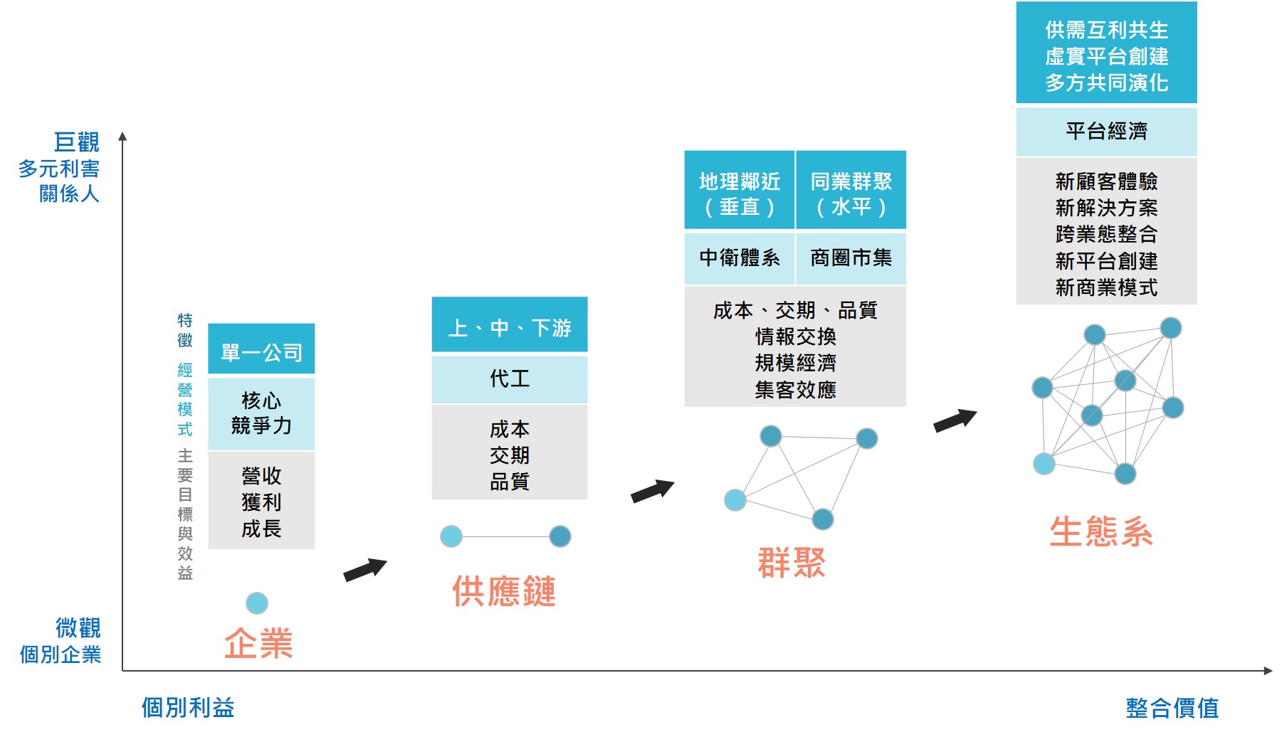 產業的發展從單一公司的獨立運作,到供應鏈上、中、下游的串接,再至產業地理又或是同業群聚的組成,顯現出產業的規模要擴大,勢必要與其他相關聯之業者合作或是合併。而生態系除了合作/合併外,也必須仰賴其他更多非預期之相關企業配合,打破地理時空等限制,這些企業可能來自不同的產業背景,運用自身優勢相互合作以及互補來創造價值,串聯建構出緊密的關係網絡。