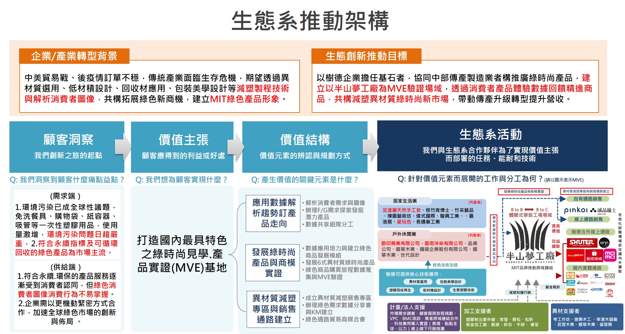 以樹德企業擔任基石者,協同中部傳產製造業者構推廣綠時尚產品,建立以半山夢工廠為MVE驗證場域,透過消費者產品體驗數據回饋精進商品,共構減塑異材質綠時尚新市場,帶動傳產升級轉型提升營收。