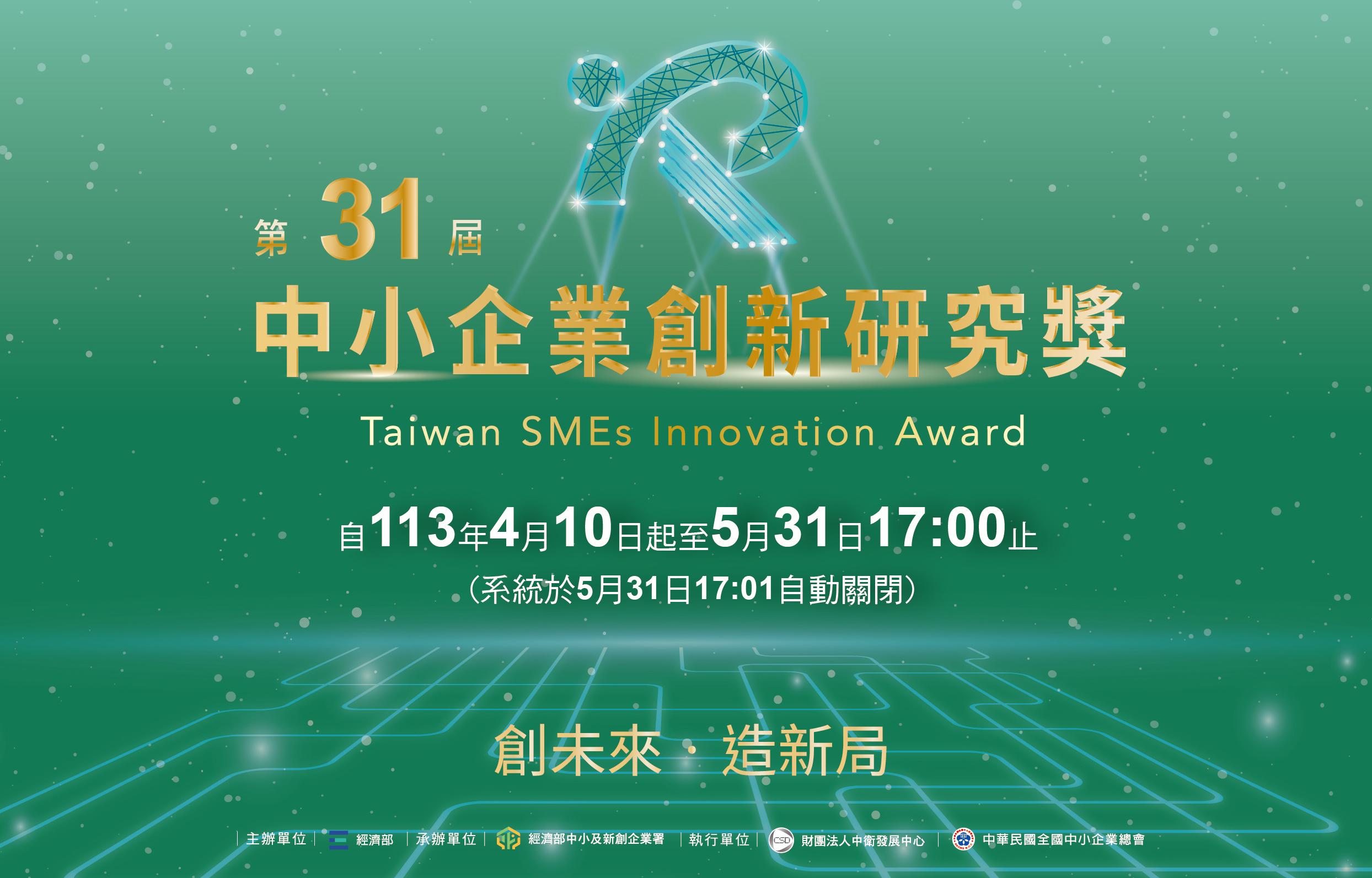 第31屆中小企業創新研究獎即日起至本(113)年5月31日17:00受理申請,凡符合行政院核定「中小企業認定標準」且仍在營運中之中小企業,並已於112年底完成自行研發之創新性產品、技術、製程、流程、服務(包含:技術服務、知識服務、商業服務)等,且已商業化運用者,皆可提出申請,審查作業分為:資格審、初審(含實地訪審)與決審,獲獎名單預計於113年11月底前公布。