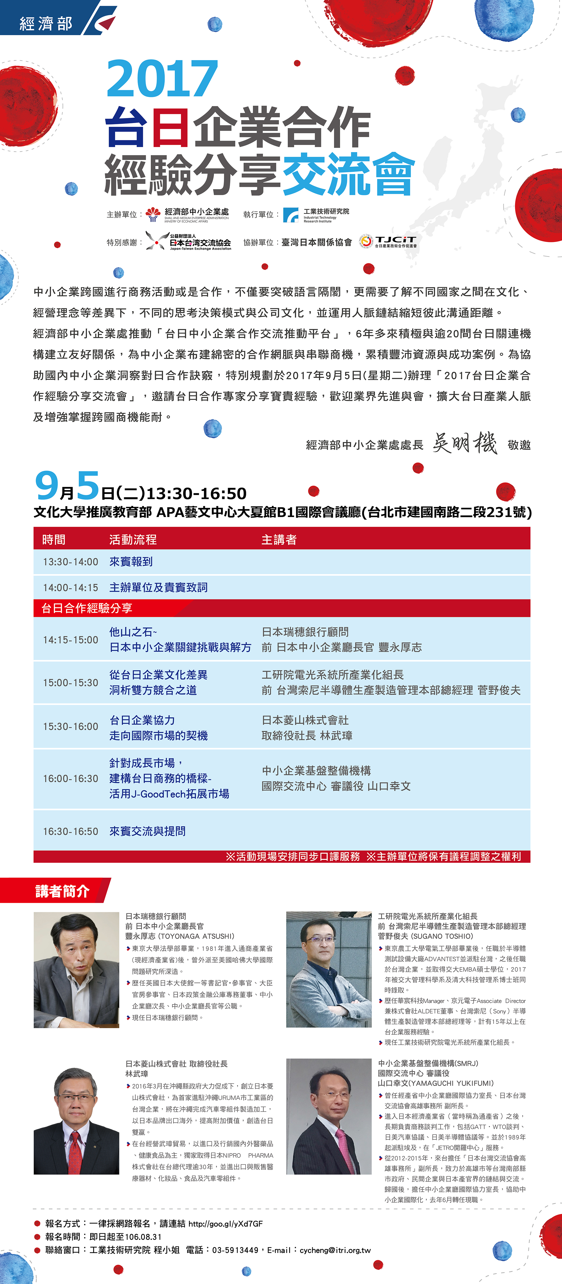 經濟部中小企業處為協助國內中小企業洞察對日合作訣竅,特別規劃於2017年9月5日(星期二)辦理「2017台日企業合作經驗分享交流會」,邀請台日合作專家分享寶貴經驗。