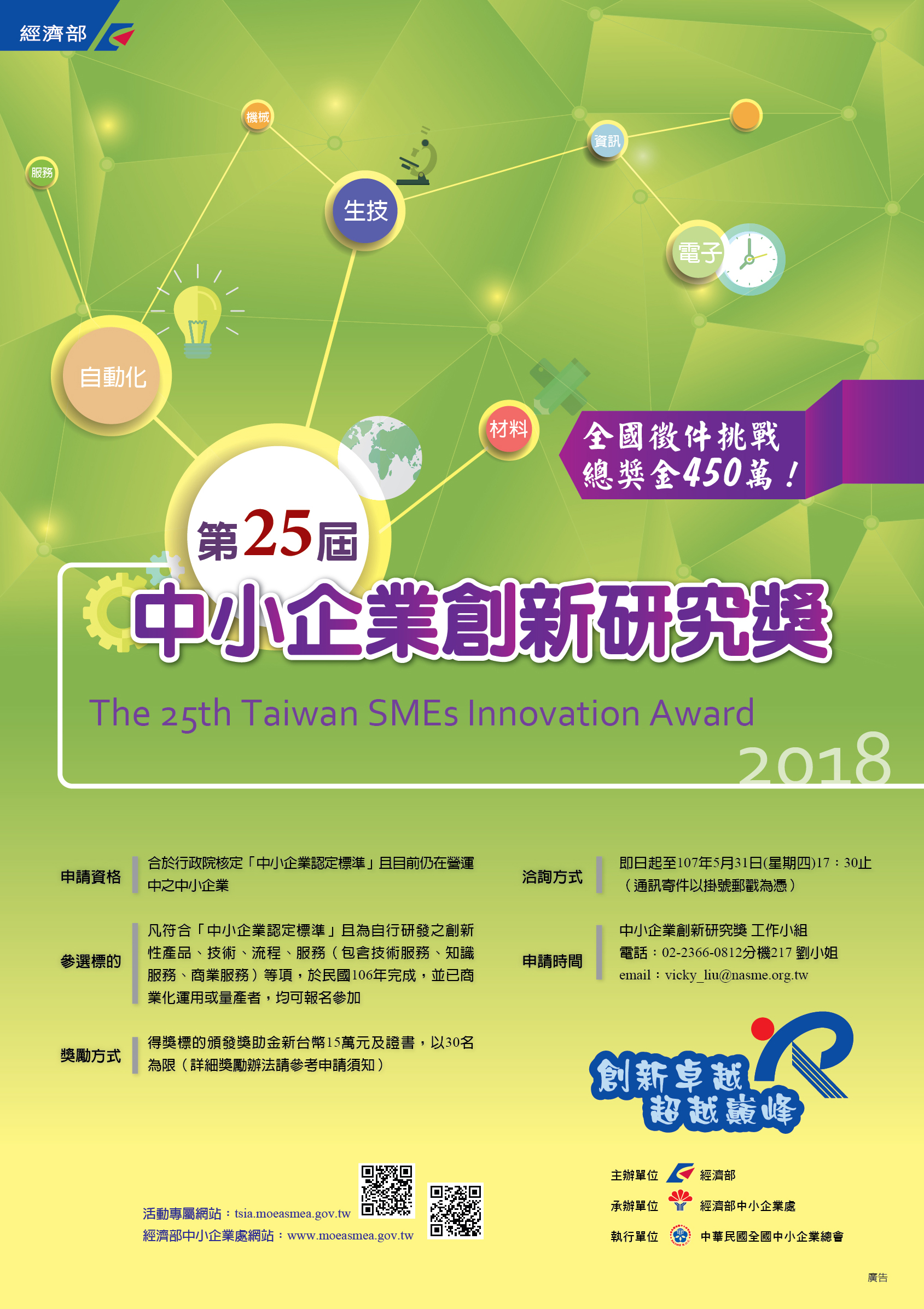 107年度第25屆中小企業創新研究獎選拔表揚活動,自即日起至107年5月31日(四)止受理報名申請,預計遴選30家中小企業之創新產品,符合申請須知相關規定並經評審通過之得獎企業將獲頒證書及新台幣15萬元獎助金,並安排該創新產品展出,提供商機交流與媒合機會,與國人分享創新研發成果之榮耀,歡迎符合資格之中小企業踴躍申請。