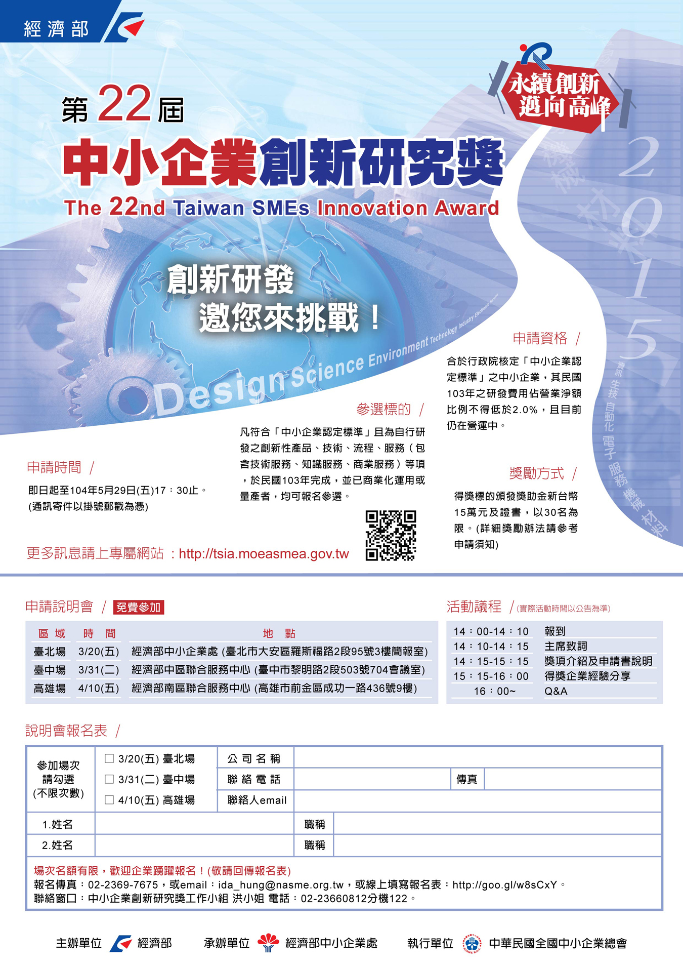 為使國內中小企業瞭解中小企業創新研究獎之內涵與申請、評審相關規範,將在北中南分別舉辦宣導說明會。說明會內容包括今(104)年之評審作業程序說明與申請書撰寫方式,並邀請曾獲獎之企業代表分享本獎項之申請經驗。