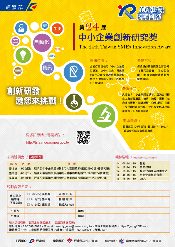 為使國內中小企業瞭解中小企業創新研究獎之內涵與申請、評審相關規範,將在北中南分別舉辦宣導說明會。說明會內容包括今(106)年之評審作業程序說明與申請書撰寫方式,並邀請曾獲獎之企業代表分享本獎項之申請經驗。