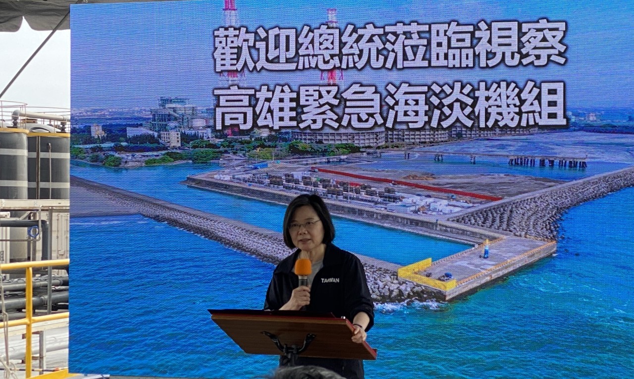 總統蔡英文今(18)日下午在高雄市長陳其邁、經濟部次長曾文生、立法委員邱志偉及水利署長賴建信與台水公司董事長胡南澤等人陪同下,視察高雄緊急海淡機組,感謝所有工作人員的辛勞,讓高雄興達電廠旁的緊急海淡機組如期產水,穩定南部地區用水需求。