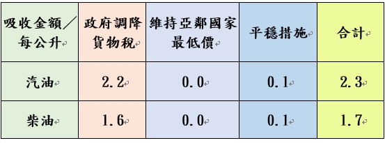 本週依油價公式及政府調降貨物稅(汽、柴油每公升各共2元及1.5元)調整國內油價,並持續以亞洲國家最低價及平穩措施運作,協助穩定國內油價,汽、柴油各需調整之0.1元均由台灣中油吸收,累計112年至4月底止,台灣中油共吸收約36.78億元。調價後各式油品參考零售價格調幅及調整金額如附表,實際零售價格以各營業點公告為準。(台灣中油與亞鄰各國油價比較表,請參考全球資訊網https://www.cpc.com.tw