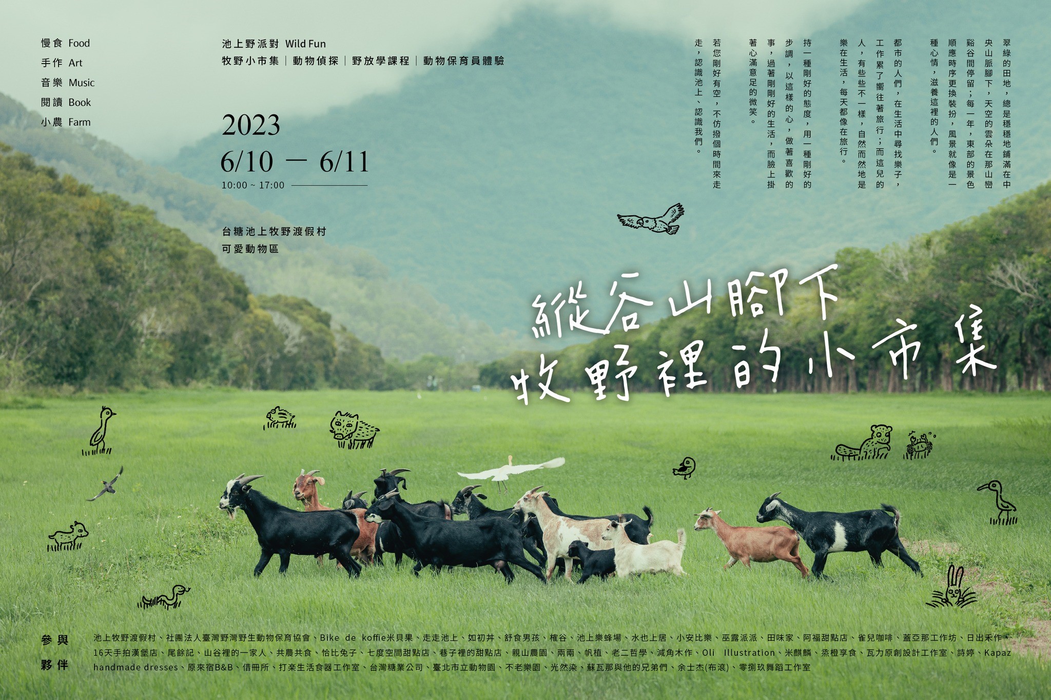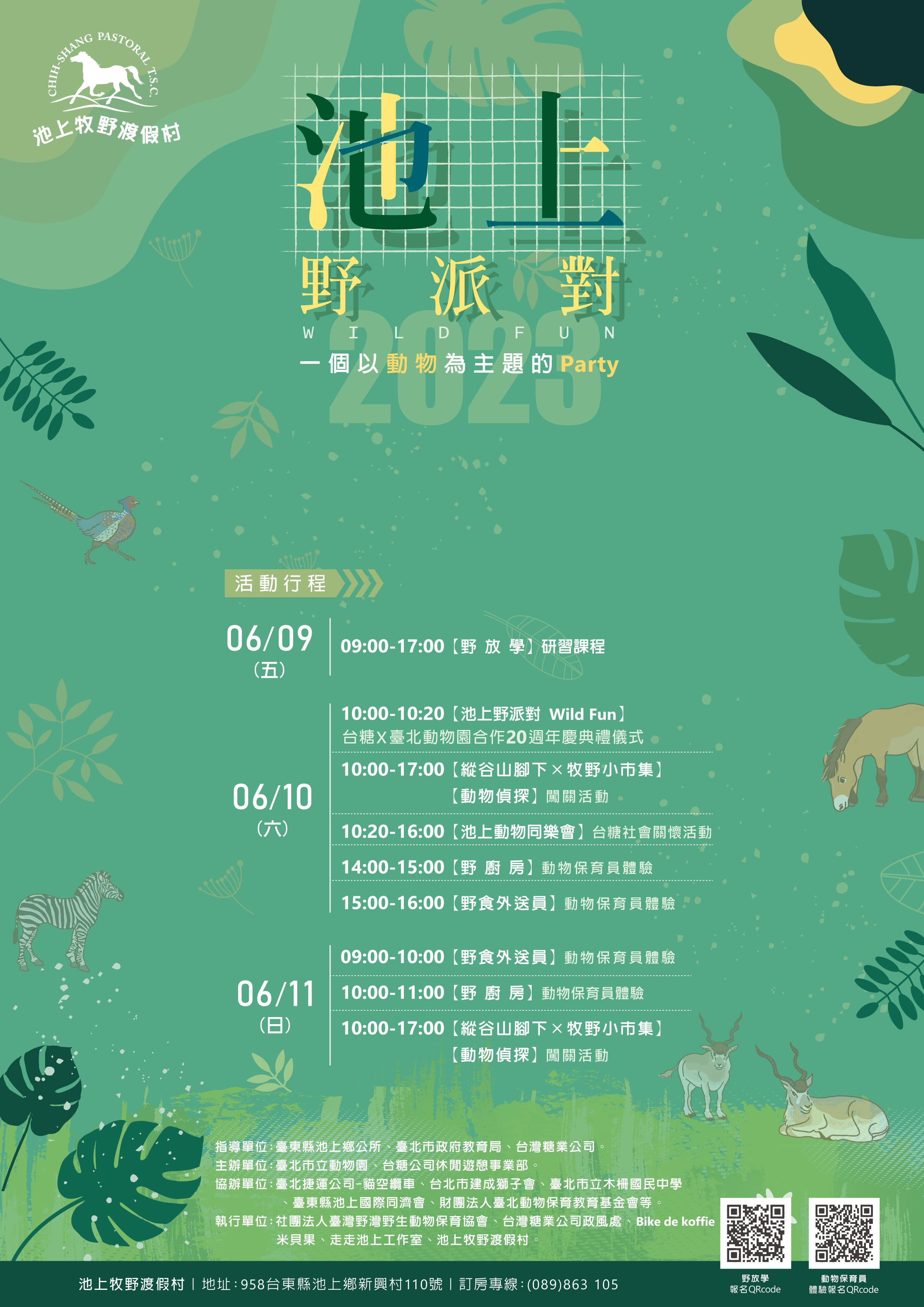 台糖表示,今年適逢台糖池上牧野渡假村與北市動物園合作「動物保育繁殖計畫」滿20周年,特舉辦「池上野派對」系列活動。本次活動除大小朋友皆可參與的「野廚房」及「野食外送員」等動保員體驗課程及闖關遊戲外,也有針對教師及自然保育員的「野放學」課程,在充滿自然氛圍及動物元素的「縱谷山腳下×牧野小市集」,享受慢食、手作及音樂表演,好吃、好看又好玩,歡迎民眾到現場一起野 Fun,嬉Run。