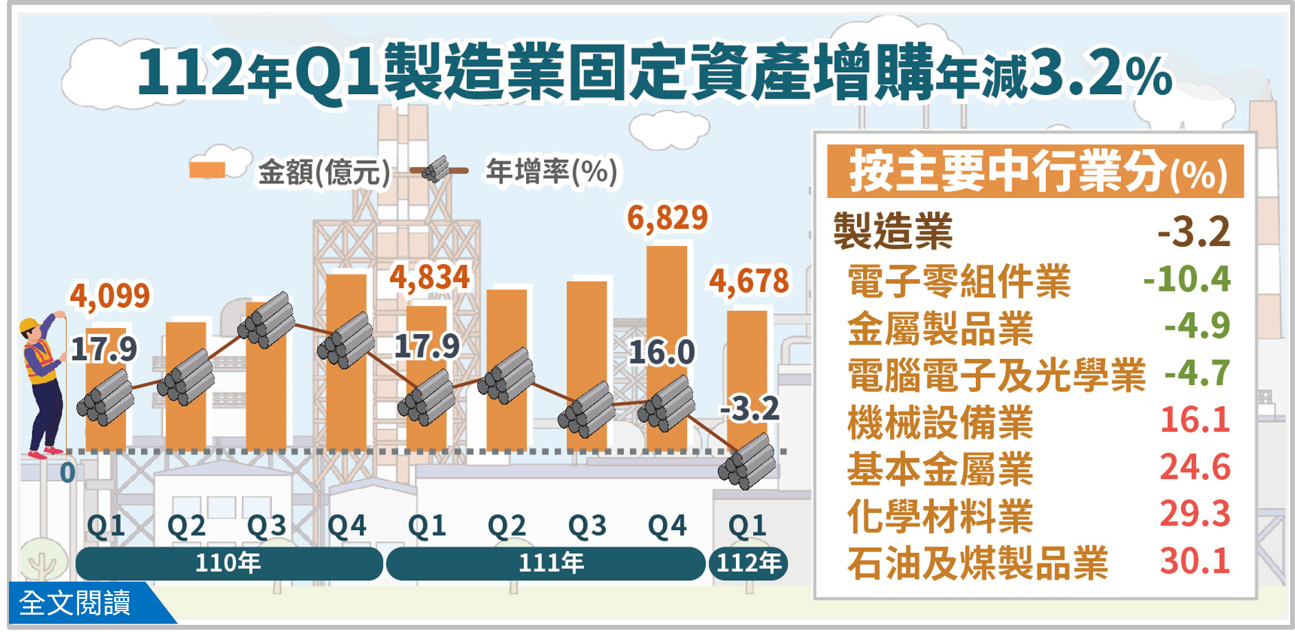 ●112年第1季製造業國內固定資產增購(配合國民所得統計定義不含土地) 4,678億元,季減31.5%,年減3.2%,主因終端消費需求減弱,半導體業者縮減或暫緩資本支出,加以上年同季基期較高所致,惟部分業者擴增節能減碳支出,抵銷部分減幅。