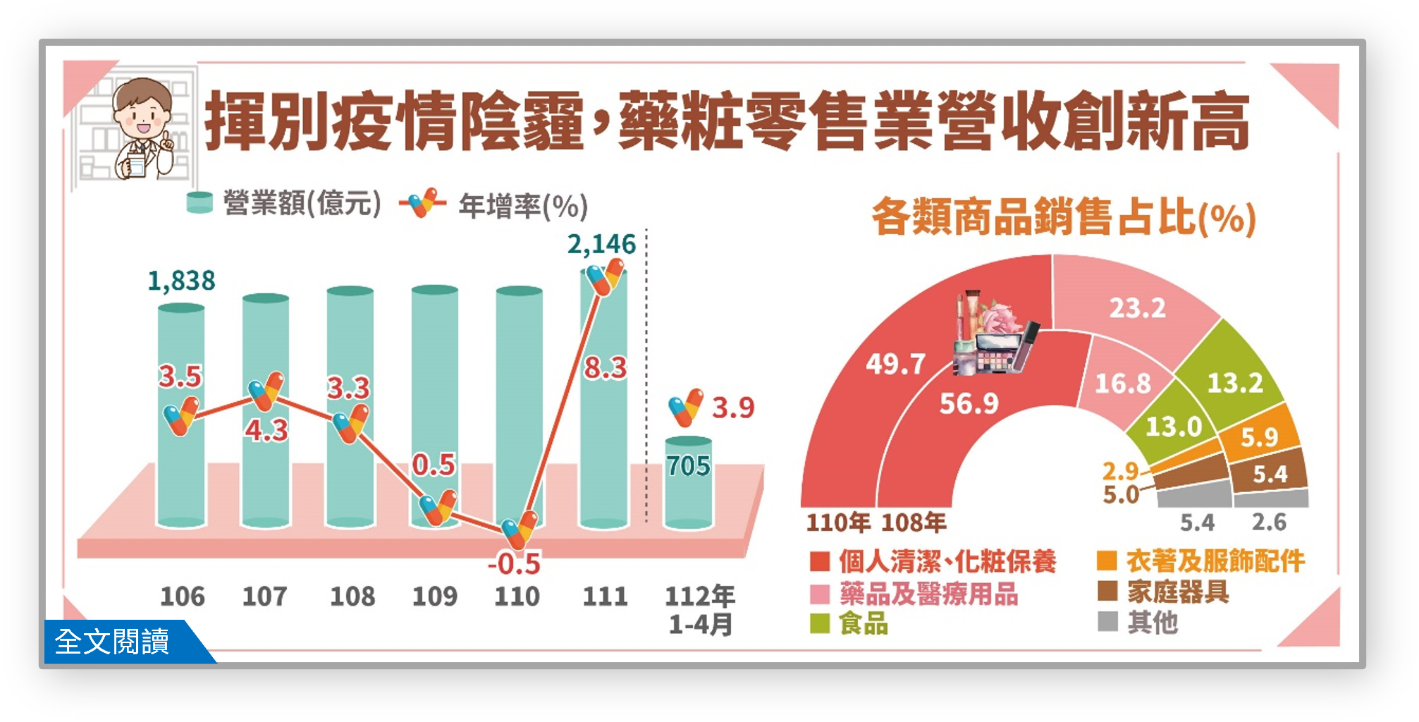 1.111年營業額超越疫情前水準,首次突破2千億:隨著高齡化社會來臨,以及國人對營養保健與美粧保養日益重視,帶動藥品、醫療及化粧品零售業(以下簡稱藥粧零售業)營業額穩健成長。109年雖有COVID-19疫情干擾,但因國內防疫得宜,加以振興三倍券加持,營業額仍成長0.5%;110年則因三級警戒管制措施趨嚴,民眾配戴口罩及居家防疫時間加長,化粧需求降低,致營收轉呈年減0.5%,結束連續8年正成長;111年隨疫情常態化,民眾接受與病毒共存,加上口罩禁令逐步放寬,以及政府發放振興五倍券等措施挹注下,全年營收首次突破2千億元大關,年增8.3%,為94年以來最大漲幅;今年前4月累計營業額705億元,亦創歷年同期新高,年增3.9%。