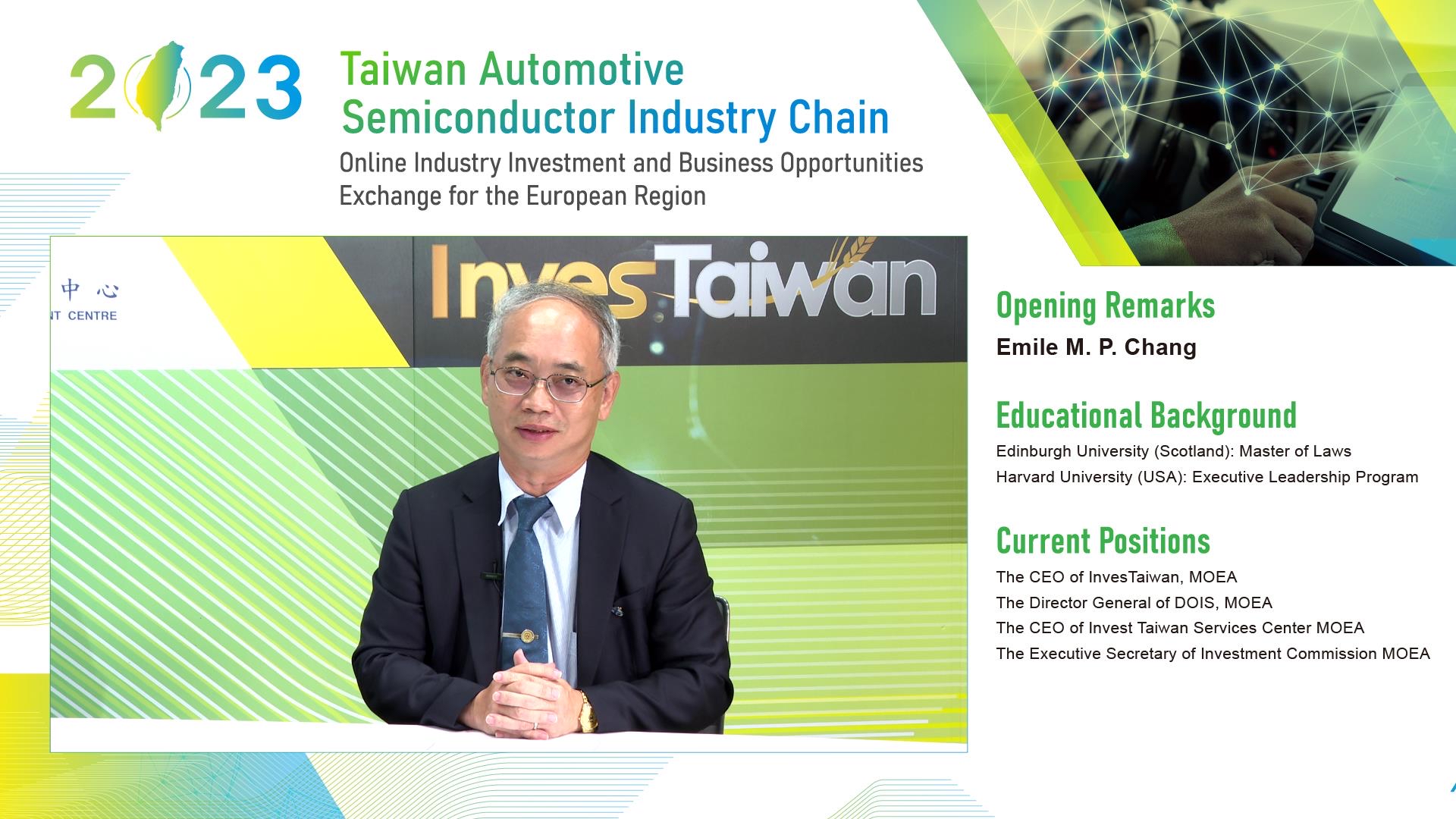 本次線上投資商機交流會聚焦「臺灣車用半導體產業鏈的發展」,向與會外商進行議題分享及意見交流,除展現臺灣車用半導體、資通訊產業、電源管理與充電系統與電動樁之軟硬體實力外,也探討國際大廠在其自家領域之技術背景下,如何與國內電子產業與車用零組件業合作之關鍵因素,另說明臺灣是全球安全且可信賴之產業合作夥伴,介紹國內研發、資金與機械設備之抵減等相關優惠。