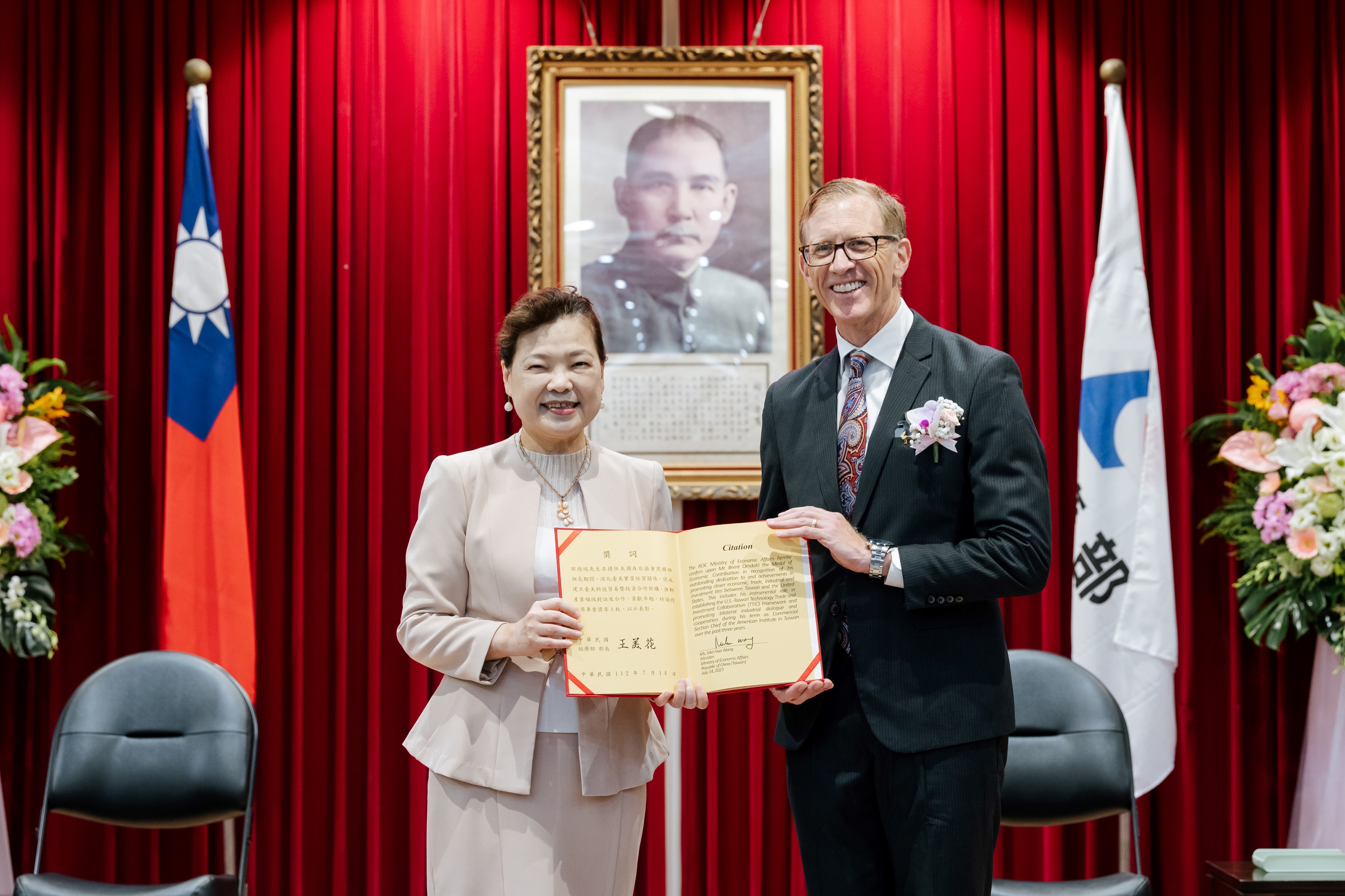 經濟部王部長美花於今(14)日上午頒贈經濟專業獎章予美國在台協會(AIT/T)商務組組長歐德瑞(Brent Omdahl),以表彰其在臺任職期間,推動臺美經貿交流合作以及促進雙邊投資的卓越貢獻。
