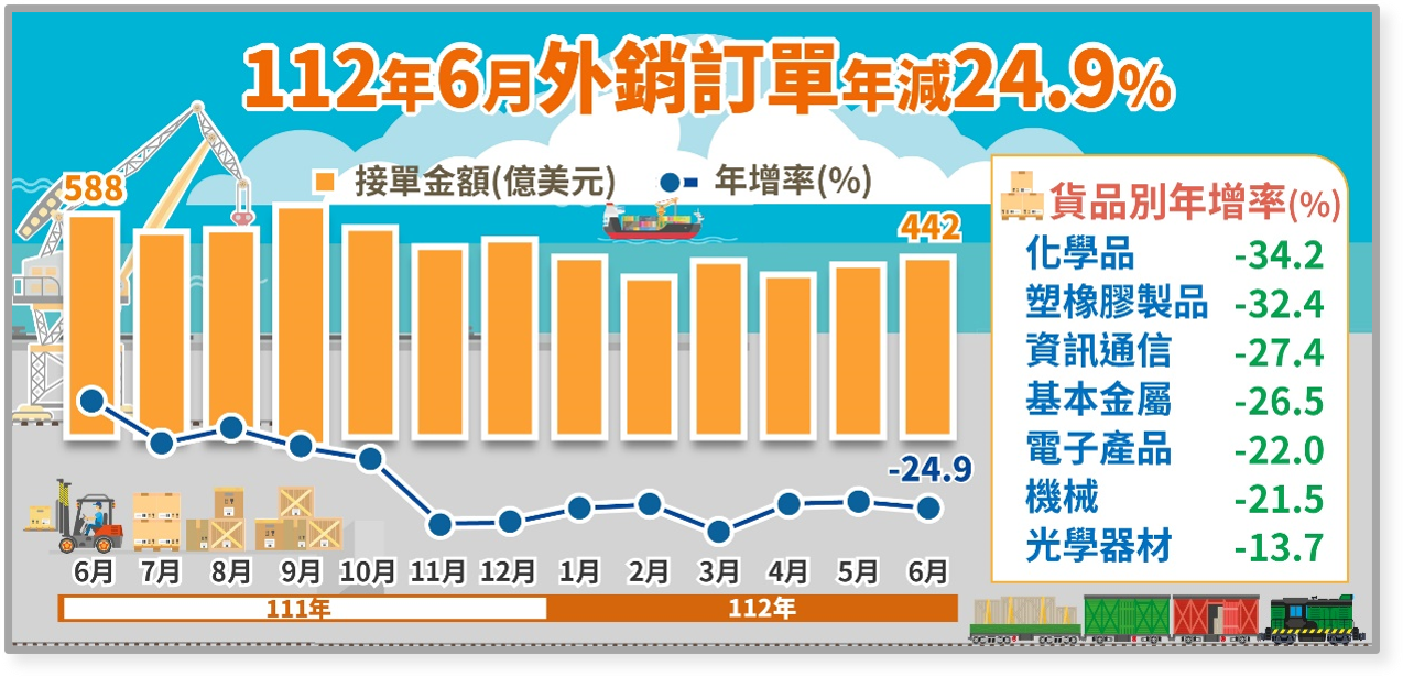 1.與上月比較:6月外銷訂單441.8億美元,較上月減少15.0億美元或減3.3%,經季節調整後減5.2%。
