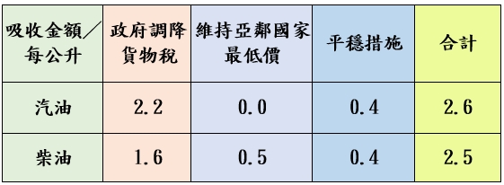 本週依油價公式及政府調降貨物稅(汽、柴油每公升各共2元及1.5元)調整國內油價,並持續以亞洲國家最低價及平穩措施運作,協助穩定國內油價,汽、柴油各需調整之0.4元及0.9元均由台灣中油吸收,累計112年至6月底止,台灣中油共吸收約41.81億元。調價後各式油品參考零售價格調幅及調整金額如附表,實際零售價格以各營業點公告為準。(台灣中油與亞鄰各國油價比較表,請參考全球資訊網https://www.cpc.com.tw之產品與服務--亞鄰各國比較表)