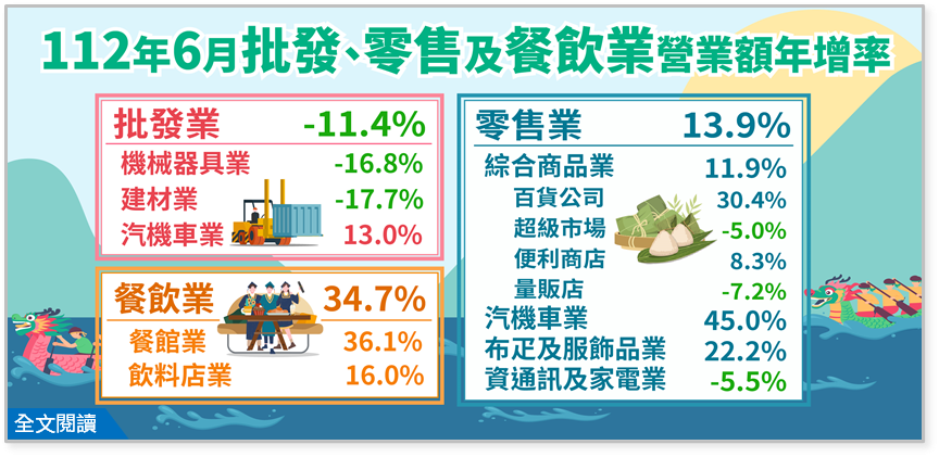 (1)營業額:6月零售業營業額為3,719億元,年增13.9%,主因疫後國內出遊人潮增加、國境解封帶動觀光客回升,加以年中慶及連假集客效應,致百貨公司、布疋及服飾品零售業、其他綜合商品零售業、食品飲料及菸草零售業分別年增30.4%、22.2%、53.8%及8.4%;汽機車零售業受惠新式車款熱銷,以及車商夏季促銷活動挹注,推升營業額年增45.0%;資通訊及家電設備零售業則因消費型電子產品買氣偏弱,年減5.5%。綜計上半年營業額為2兆2,274億元,創歷年同期新高,年增9.0%。