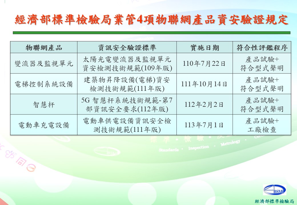 物聯網使用日漸普及,為日常生活帶來便利,但物聯網設備從遠端連線提供服務時,可能產生資訊安全疑慮,其中如何保護使用者個人資料隱私及確保網路連線安全更顯重要,經濟部標準檢驗局為確保「智慧杆」、「再生能源系統變流器」、「電動車充電設備」及「電梯控制系統設備」等4項物聯網設備之資訊安全,自110年起至112年陸續公告實施「智慧杆」、「再生能源系統變流器」、「電動車充電設備」及「電梯控制系統設備」等4項物聯網終端產品自願性產品驗證(VPC)納入資訊安全驗證,確保物聯網設備資訊安全,保護消費者權益。