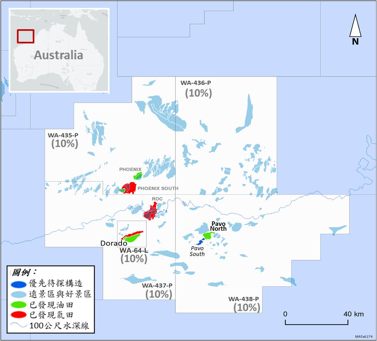 台灣中油公司於海外油氣探採再有進展,繼今年2月21日以全資子公司OPIC Australia名義與澳洲Carnarvon公司簽署礦區買賣契約後,現全案已獲澳大利亞聯邦海域石油管理局及澳大利亞外商投資審查委員會核准,昨(15)日取得WA-64-L生產礦區Dorado油田及其鄰近WA-435-P、WA-436-P、WA-437-P和WA-438-P四個探勘礦區各10%礦權權益。