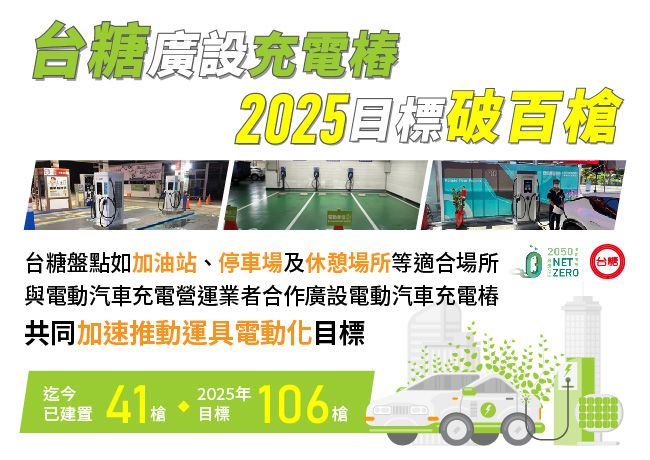 運具的電動化及無碳化是實踐淨零排放的一項關鍵策略,台糖公司為響應國家淨零排放政策,積極與業者合作建置電動汽車充電樁,協助建置邁向運具電動化的基礎設施。現在台糖旗下據點已完成設置41支充電槍,並陸續增設中,預計2025年將達成設置106支充電槍的目標。台糖期許能藉此促進電動車普及率,以實現淨零排放的環境永續目標。