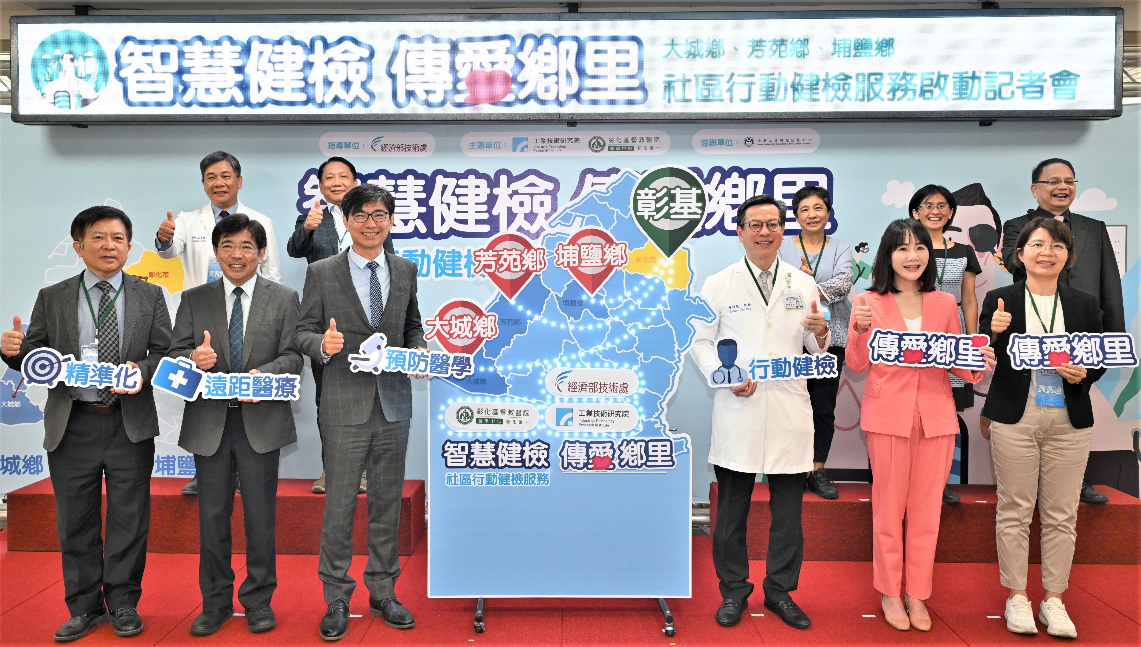 經濟部今(5)日與工研院、彰化基督教醫院,共同舉辦「社區行動健檢服務啟動記者會」,運用科技專案與業者合作開發的10項可攜式醫材設備,及整合各項檢查數據與提供遠距跨專科會診的智慧醫療資訊平台,先以彰化縣大城、芳苑、埔鹽三鄉鎮為場域,啟動智慧行動健檢服務,將服務帶入醫療資源不足的鄉鎮。