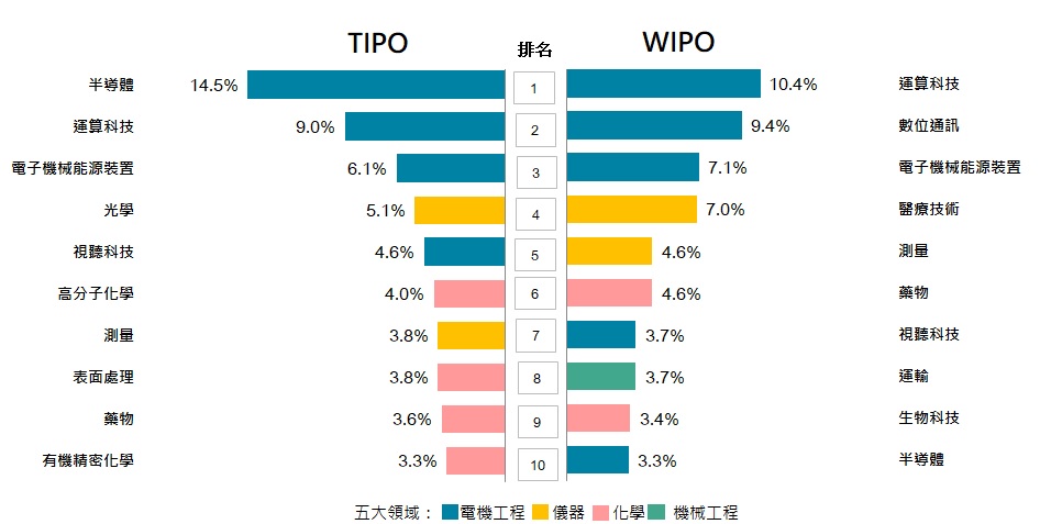 三、我國發明專利申請以「半導體」領域居首,WIPO則以「運算科技」最多
