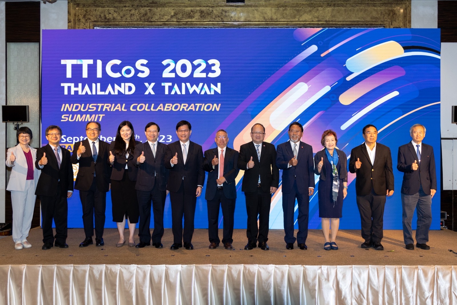 「2023臺泰產業鏈結高峰論壇」(第7屆) 9月12日在泰國曼谷Sukosol飯店登場。論壇由工業總會與泰國工總(FTI)主導,臺灣食品所、泰國食品院(NFI)共同籌辦,現場匯聚二百五十多位來自臺灣及泰國產業代表。臺灣工業總會謝其嘉總召集人及泰國工總Mr. Kriengkrai Thiennukul主席共同出席,總統府林秘書長佳龍及經濟部林次長全能擔任貴賓,為雙方產業合作的未來勉勵期許。