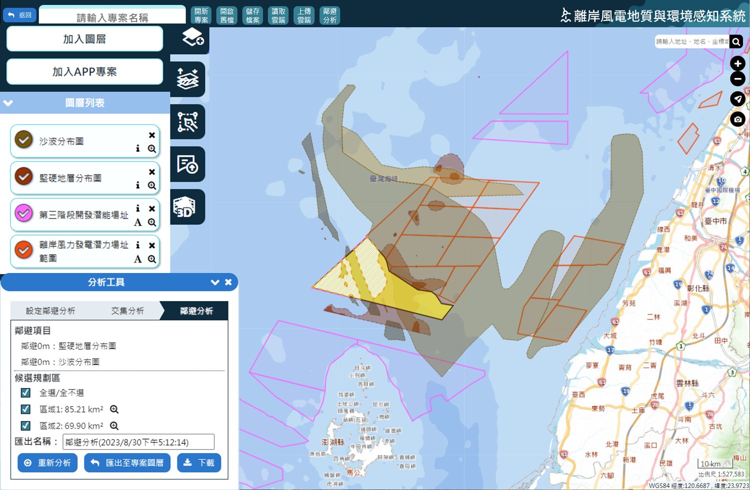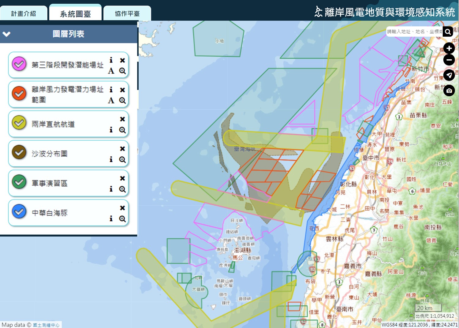 政府力促能源轉型及2050淨零政策,離岸風電已然成為臺灣綠能發展的關鍵戰略之一。為加速離岸風電建置效率,經濟部中央地質調查所(簡稱地調所) 持續推動風場海域地質調查,目前已完成彰濱風場海域區域尺度地質調查成果解釋分析,並發布於地調所建置之「離岸風電地質與環境感知系統」 (網址:https://windpower.geologycloud.tw/map),除了原有的查詢功能,現更開放協作平臺的嶄新功能,可套疊風場規劃位置及相關環境敏感或限制區位(包括:管制範圍、經濟活動、環境保育等24種圖資)及地質調查資料(圖1),可供風場規劃及決策評估參考,將專業調查資訊引入實務操作,全力推進風電綠能的蓬勃發展。