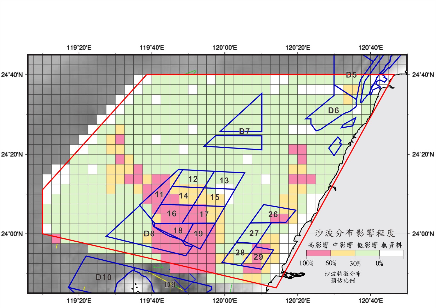 依據海域地質調查成果,地調所評估分析可能影響風機基礎安全的地質影響因子,包括淺層斷層(約海底以下120公尺深度以內的斷層)、沙波飄移(海床面因海流的變動)、氣煙囪(流體移棲,海床以下探測到有流體(氣體+水)的存在,地層承載力不足)及淺層火成岩(例如澎湖玄武岩,分布在海底下100公尺以內)等。在現有離岸風電規劃場域,例如在東側近岸區有較多的氣煙囪、南側場域靠近澎湖群島有不均勻分布的淺層玄武岩、中央區之彰雲沙脊有廣泛的沙波移動,以及在北側有較多的淺層斷層等(圖2)。透過「離岸風電地質與環境感知系統」開放的協作平臺,可直接套疊規劃開發風場區塊與各種地質影響因子在區塊內外的分布情況,平臺中3D模式將調查剖面資料以海底定位最直觀的方式呈現,協助使用者充分認識與瞭解區域的地質概況(圖3)。