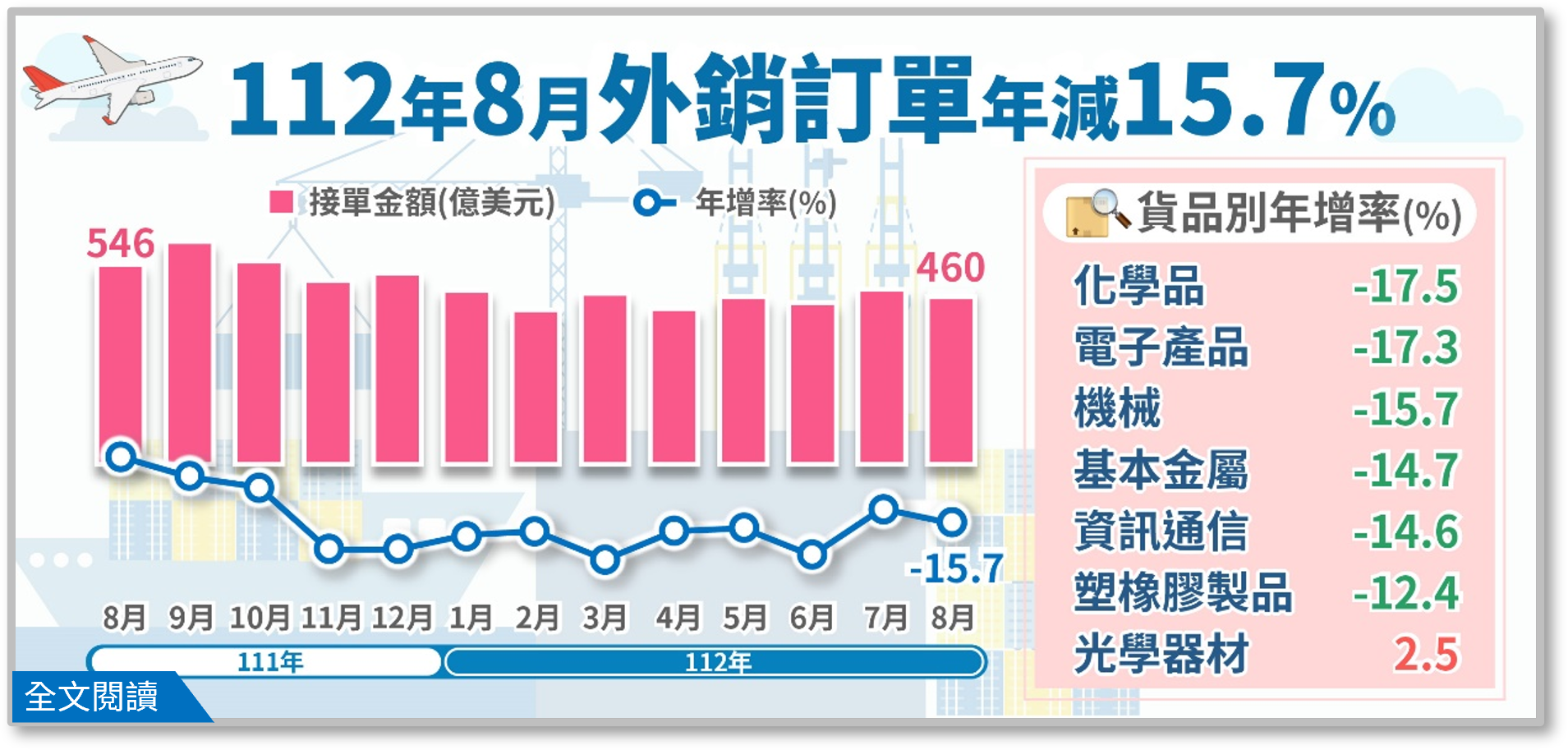 1.與上月比較:8月外銷訂單460.4億美元,較上月減少16.9億美元或減3.5%,經季節調整後減1.8%。