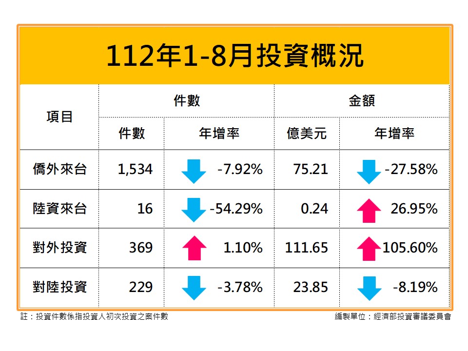 陸資來臺投資方面,112年1-8月核准陸資來臺投資件數為16件,較上年同期減少54.29%;投(增)資金額計美金2,393萬6,000元(折合新臺幣7億1,808萬元),較上年同期增加26.95%。自98年6月30日開放陸資來臺投資以來截至112年8月,累計核准陸資來臺投資件數為1,572件,核准投(增)資金額計美金25億9,019萬元(折合新臺幣777億570萬元)。