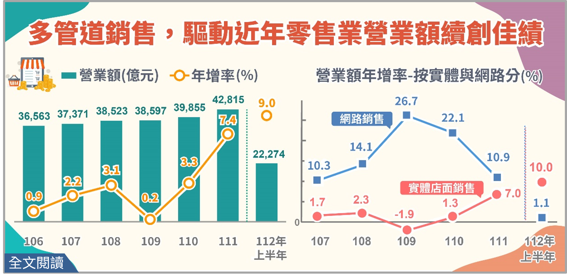 1.近3年零售業營業額平均成長超越疫情前水準:零售業營業額為反映民間消費之重要指標,近年來因疫情實施社交距離、居家隔離等措施,使零售業營收起起伏伏,惟在業者積極轉型及促銷下,111年零售業營收規模突破4.2兆元,創歷年新高,近3年(109~111年)平均成長3.6%,優於疫情前3年平均(106~108年)之2.1%。今年上半年營業額2.2兆元,創歷年同期新高,年增9.0%,預期全年將可望站穩4.5兆元,續創新高。