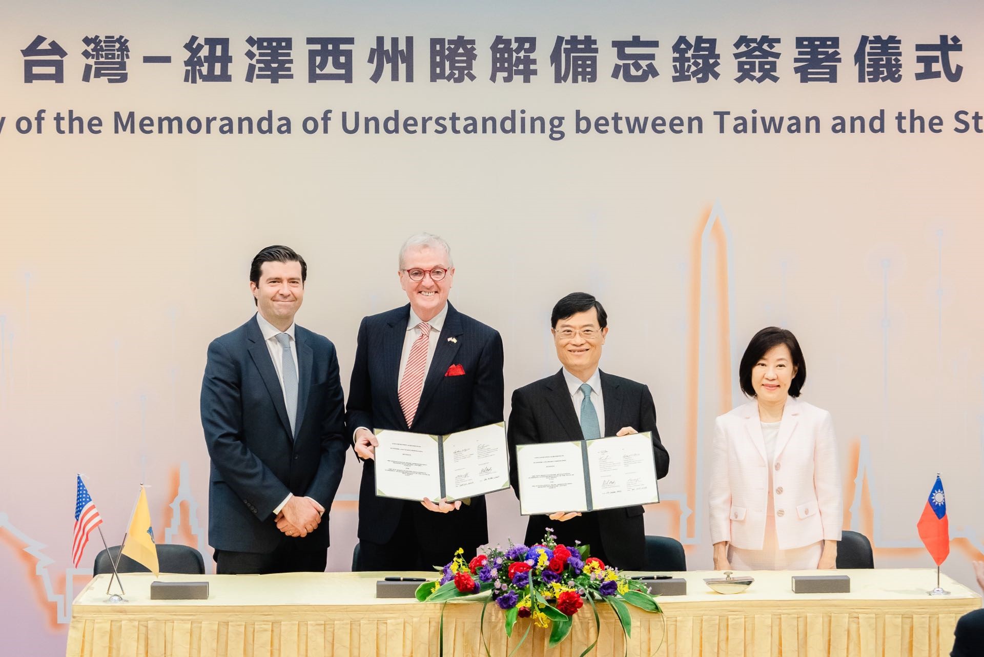 經濟部國際貿易署江文若署長與紐澤西州經濟發展廳廳長蘇利文(Tim Sullivan)今(20)日在外交部簽署「臺灣-紐澤西州經貿合作協議」,並由經濟部陳正祺政務次長及美國紐澤西州州長墨菲(Philip Murphy)在場見證。