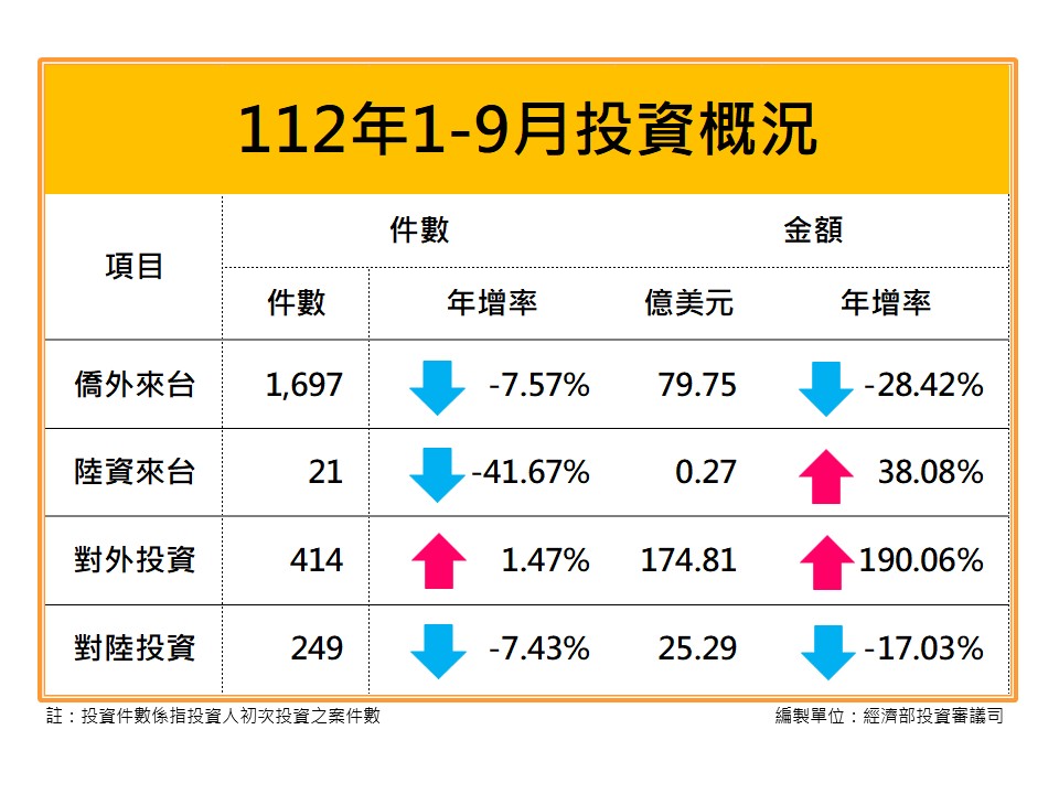 根據本部投審司統計,112年1-9月核准僑外投資件數為1,697件,較上年同期減少7.57%;在核准金額部分,投(增)資金額計美金79億7,451萬8,000元(折合新臺幣2,392億3,554萬元),較上年同期減少28.42%,主要係因111年1-9月投資金額為近15年來新高,比較基期較高所致,然112年1-9月投資金額仍為近15年來第3高。112年1-9月核准新設公司件數為929件,新設公司投資金額美金6億3,354萬7,083元(折合新臺幣190億641萬2,492元);另112年1-9月核准新南向國家來臺投資件數為470件,較上年同期增加35.45%,投(增)資金額計美金24億609萬6,000元(折合新臺幣721億8,288萬元),較上年同期增加25.59%,其中投資來源地主要為新加坡、泰國及馬來西亞。