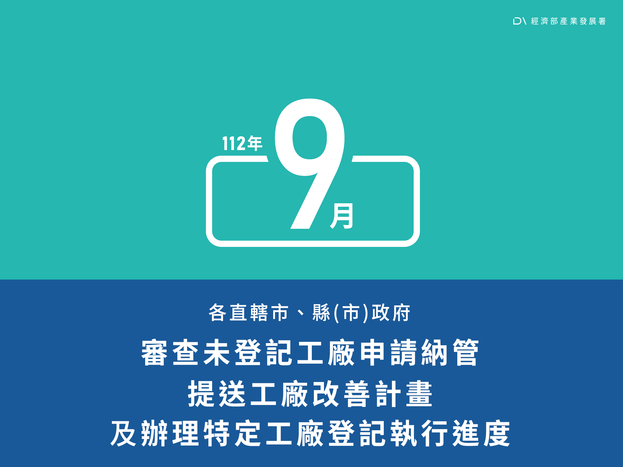 截至本(112)年9月份,經濟部督導各直轄市、縣(市)政府審查未登記工廠申請納管、提送工廠改善計畫及辦理特定工廠登記之進度,分別摘要說明如下: