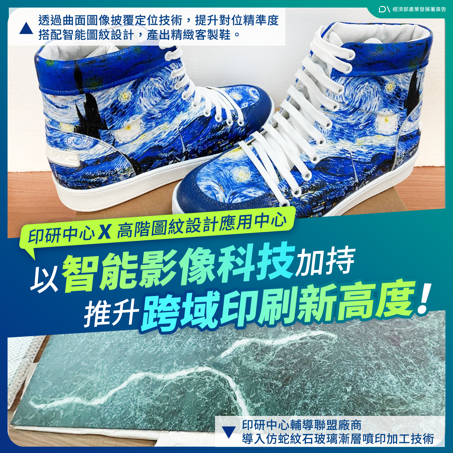 另外,在數位印刷科技的高度發展下,客製化市場已然成為主流,為滿足消費者多元化表面裝飾需求,在生產技術上正逐漸朝向半成品/成品印刷再加工發展,針對立體型態的產品,印研中心結合坤澤興業有限公司,運用數位相機圖像定位技術,可在翹曲面上直接進行彩色噴印,並搭配智慧圖紋風格轉換、線上3D設計平台,提供客戶即時的產品圖紋設計工具,將技術成果應用於旅狐國際股份有限公司的客製噴繪鞋,未來可持續輔導產業跨足運動帽、T恤、袋包、帆布鞋等高附加價值客製化精品市場。