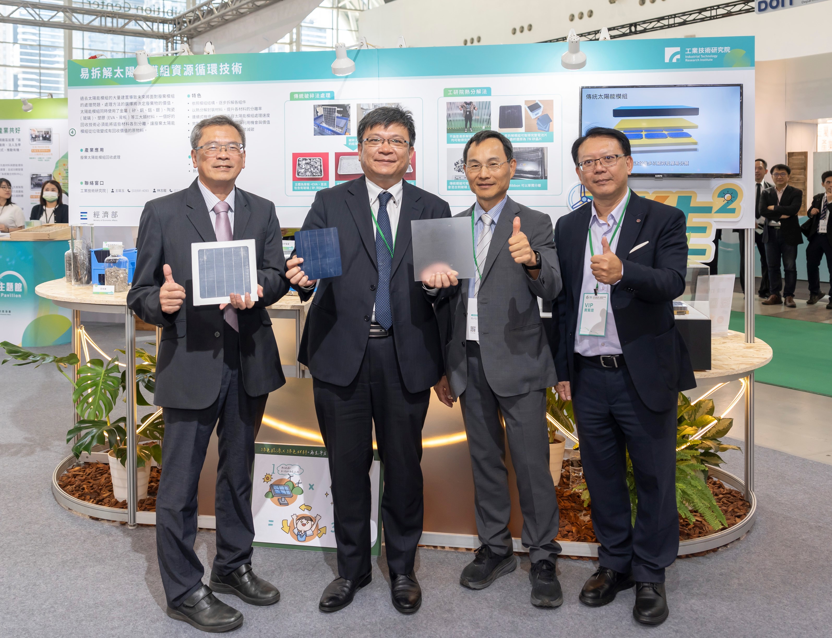 經濟部次長曾文生於開幕典禮致詞中指出,台灣是外貿導向國家,面對全球淨零須位居領先群中,不但方向要對更要跑得快,才能在國際供應鏈中占有一定的角色!這次經濟部臺灣永續主題館的展出主題是有一就有二,一是「衣脈相傳」;二是「再生平方」。前者,國內研發首創手持式衣物分選器,快速準確進行廢布分類,依照材質推動多元利用成功打造了跨域循環新模式;後者是讓再生能源設備太陽能板及風機葉片也循環再利用,其中傳統太陽能板晶片模組是層層堆疊,就如冷凍千層派,難以分開。在工研院的研發下,只要加熱即可將太陽能模組快速且完整分解,回收再利用。
