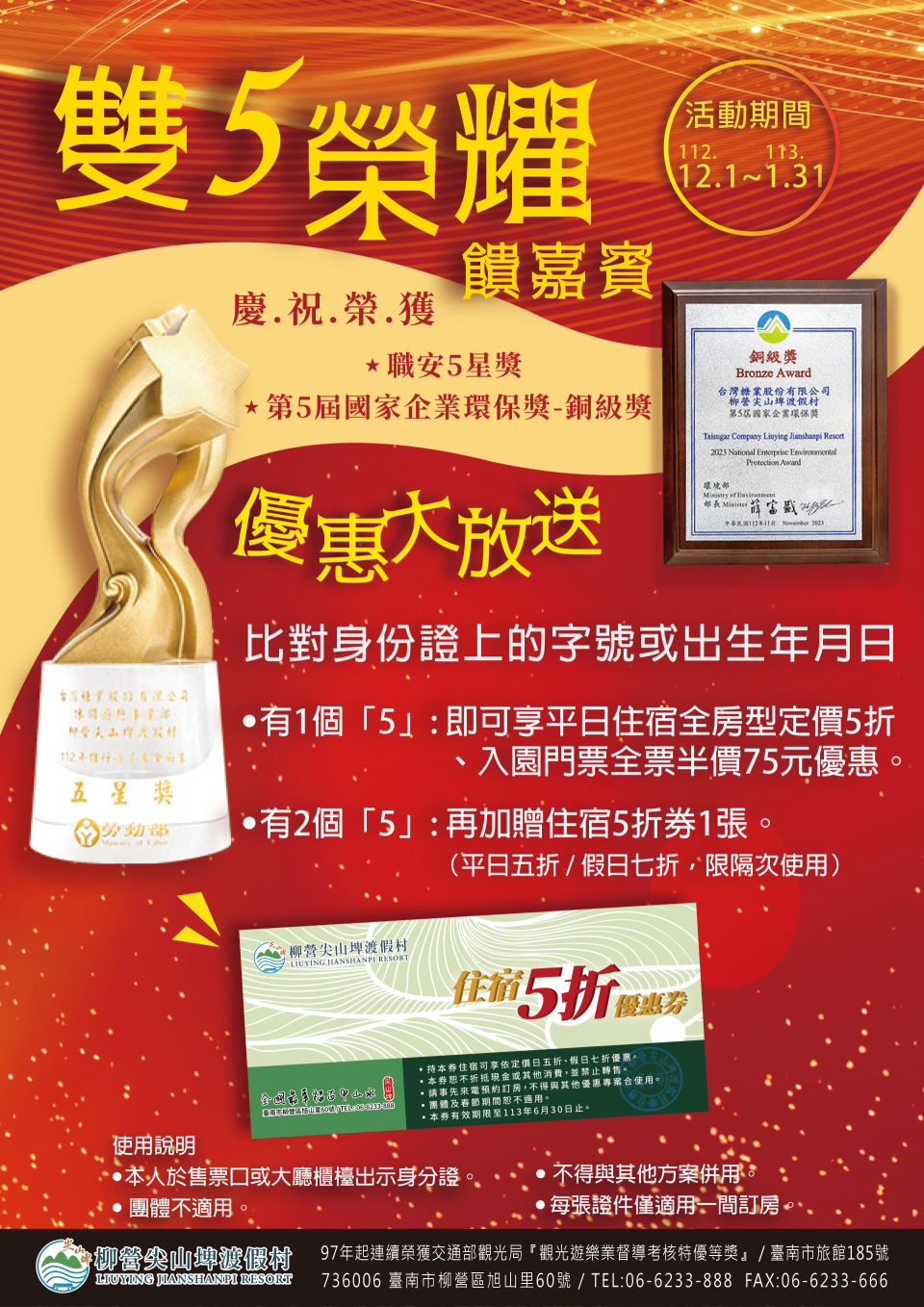 台糖柳營尖山埤渡假村近期雙獎臨門,連獲職安5星獎及第5屆國家企業環保獎「銅級獎」肯定,為分享榮耀並回饋民眾,自112年12月1日至113年1月31日止,只要本人身分證字號或出生年月日對中1個「5」,即可享平日住宿5折、入園門票半價75元優惠(不累計、團體不適用);若對中2個「5」,再加碼送住宿5折優惠券1張(不累送),歡迎呼朋引伴來尖山埤,體驗園方真誠又甜蜜的服務。