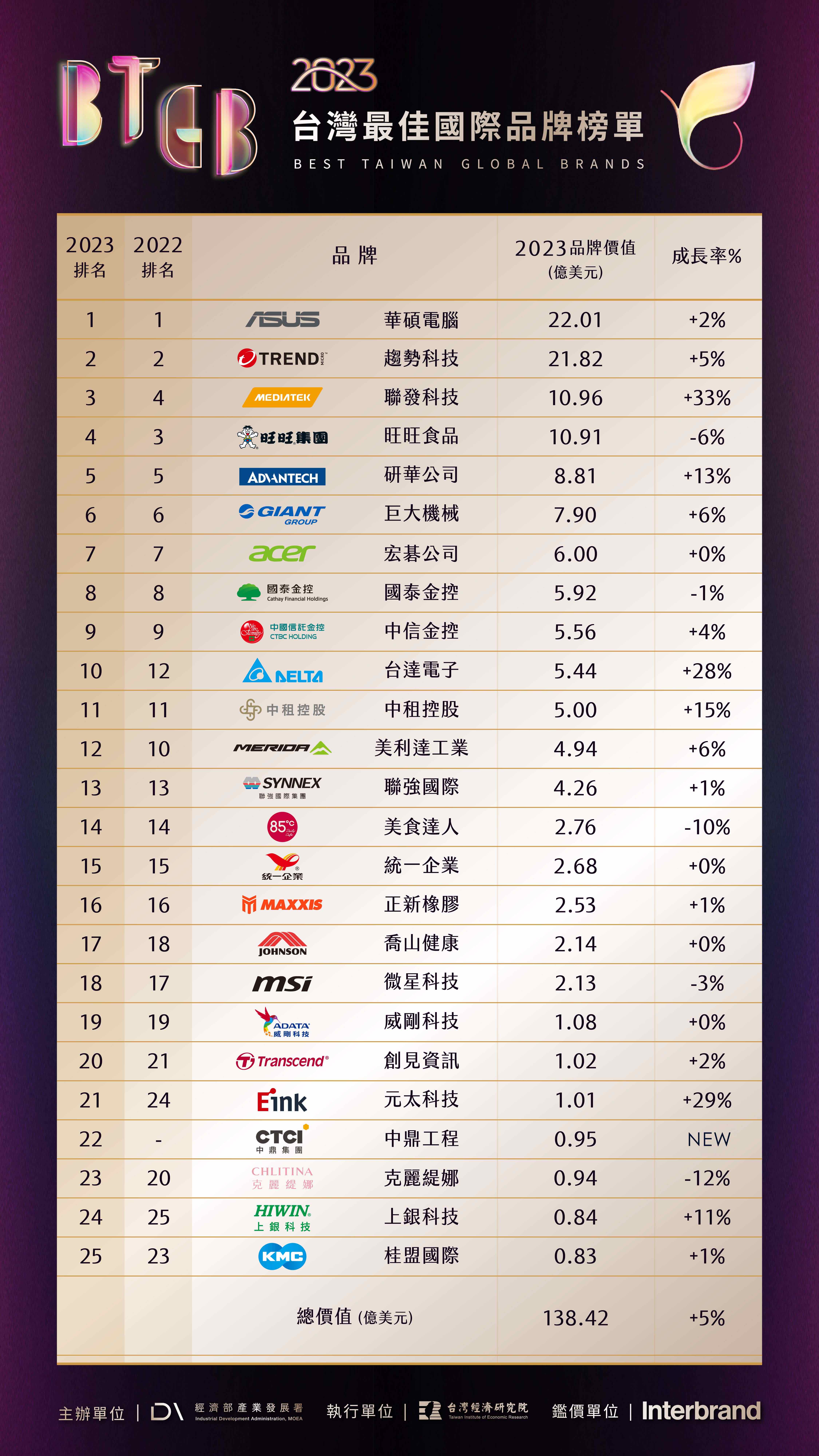 台灣最佳國際品牌價值調查,由經濟部產業發展署主辦,委託全球第一家獲得ISO 10668認證、國際權威品牌價值調查機構Interbrand進行鑑價,採用曾協助美國商業週刊(Business Week)進行「全球百大品牌價值調查」之同等品牌鑑價機制,兼顧量化財務分析與品牌經營管理面向的質化構面分析,從國際視野協助台灣企業評估自身品牌價值。根據今年品牌價值調查結果,Interbrand點出2023年度品牌趨勢關鍵字「Redefine:Non-Stop Evolving」,縱觀全球產業環境與科技應用快速變遷,品牌不僅止於跟隨趨勢,更要勇於開創全新格局,重新定義自身價值,展現持續進化、引領趨勢的影響力。
