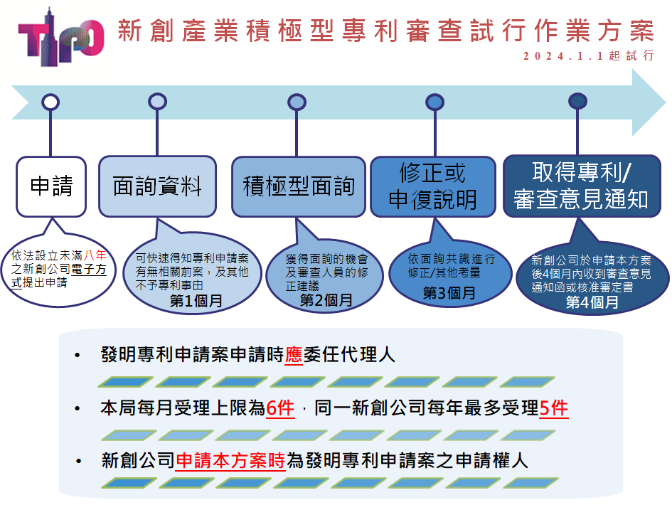 為促進新創產業發展,協助具研發能力的新創公司儘速確認發明專利取得可能性及加速獲證,以利智慧財產權布局,智慧局修正「新創產業積極型專利審查試行作業方案」(以下稱「本方案」),再行鬆綁本方案之申請人資格,只要係新創公司申請本方案時為發明專利申請案之申請權人即可適用,不限於一開始申請專利時必須已成立新創公司,修正方案自113年1月1日生效實施。