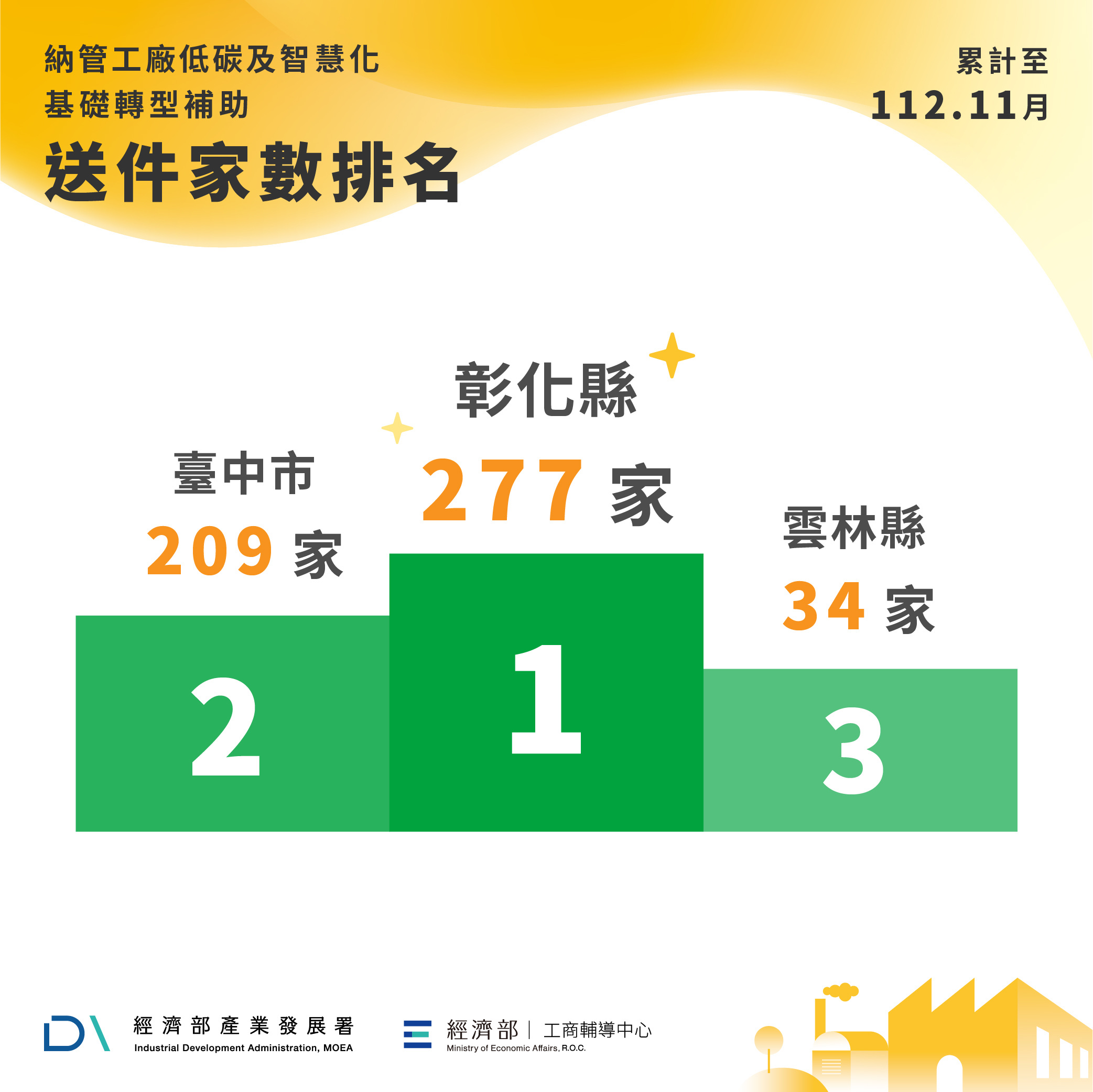 經濟部將持續督導地方政府審查進度,業已研訂「優化工廠改善計畫審核作業工作指引」,提供地方政府精進審核作業效率之參考。另為協助納管工廠導入低碳化、智慧化等技術或設備更新,已核定工廠改善計畫者可提報基礎轉型個案補助計畫向本部申請最高上限150萬元經費補助。截至112年11月,業者送件申請基礎轉型補助情形如表三,以彰化縣最多277家、其次臺中市209家、再次雲林縣34家。請地方政府加速審查速度,讓業者落實工廠環保及消防等設施改善,早日取得合法工廠資格。