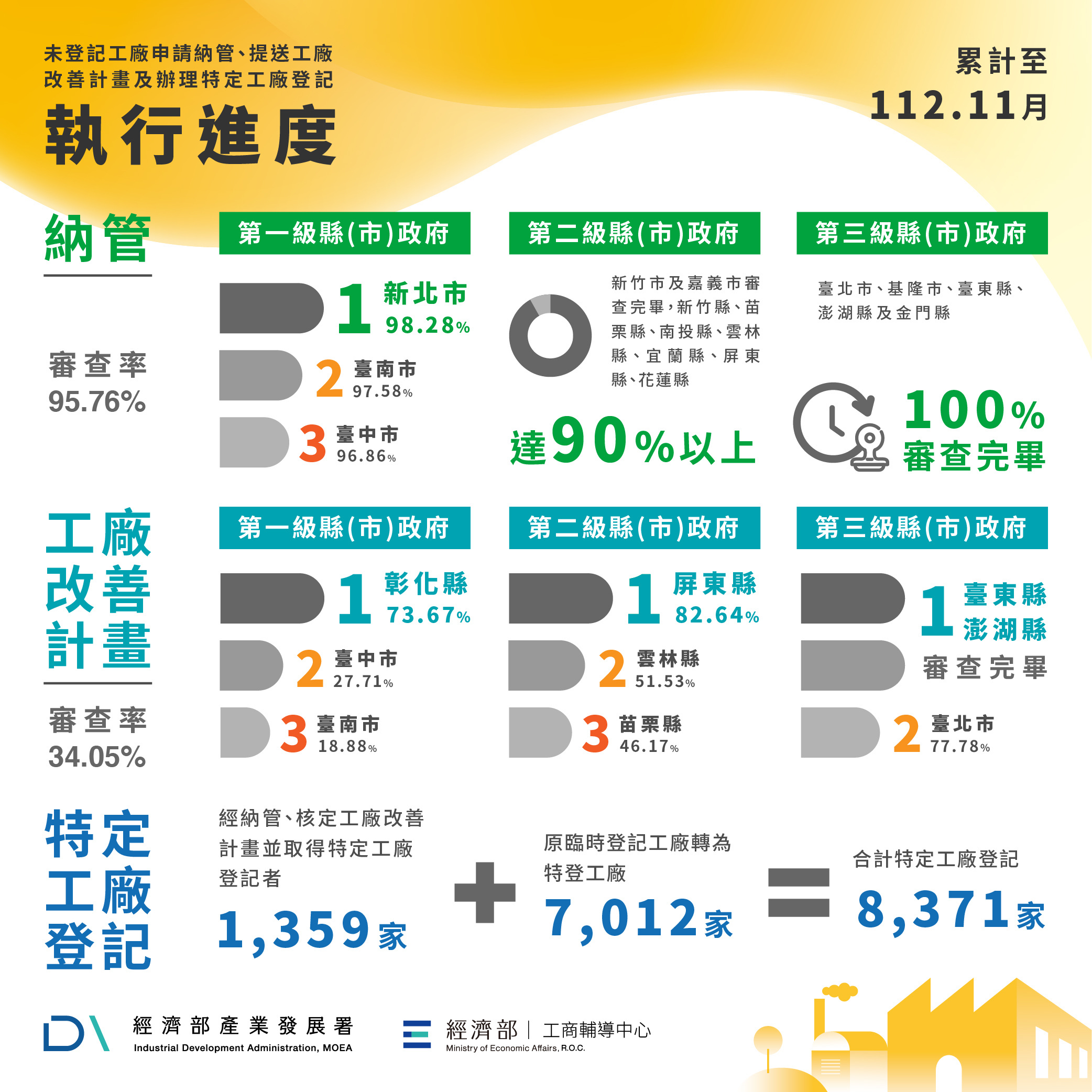 截至本(112)年11月份,經濟部督導各直轄市、縣(市)政府審查未登記工廠申請納管、提送工廠改善計畫及辦理特定工廠登記之進度,分別摘要說明如下: