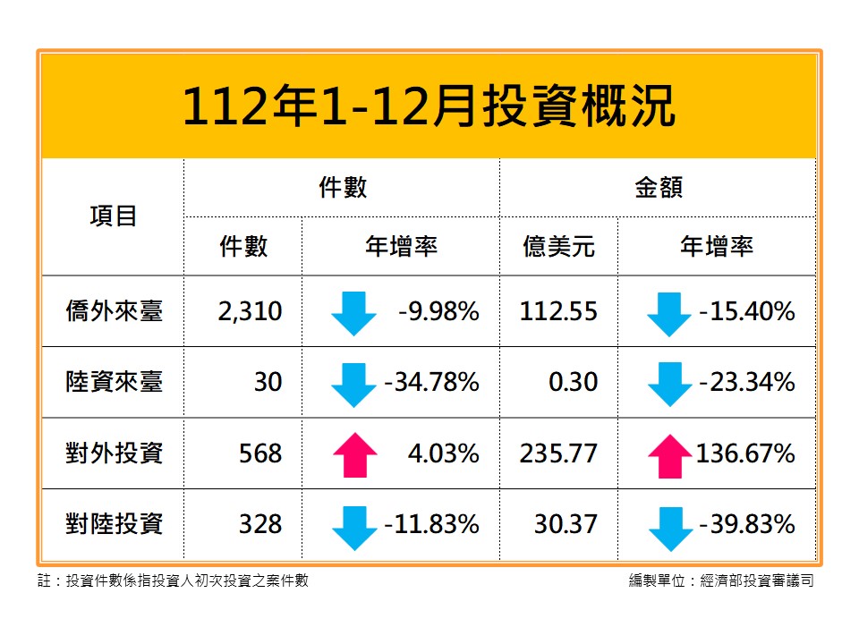 112年1-12月核准僑外投資新設公司件數為1,231件,投資金額為美金6億9,247萬7,928元(折合新臺幣約207億7,433萬7,858元);另112年1-12月核准新南向國家來臺投資件數為662件,較上年同期增加37.63%,投(增)資金額計美金25億3,906萬7,000元(折合新臺幣761億7,201萬元),較上年同期增加22.45%,其中投資來源地主要為新加坡、泰國及馬來西亞。