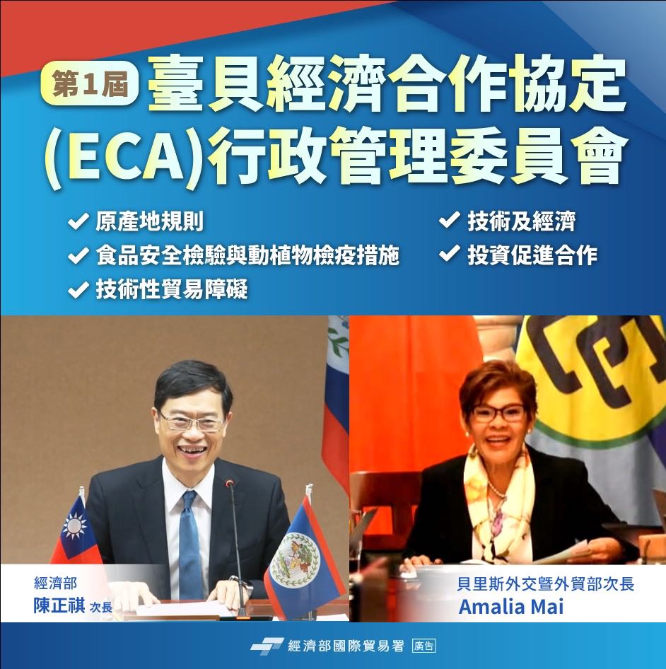 臺貝里斯經濟合作協定(ECA)行政管理委員會19日舉行首屆會議,由經濟部政務次長陳正祺與貝里斯外交暨外貿部次長艾蜜麗亞(Amalia Mai)以視訊方式共同主持,並達成多項具體成果,有助雙方在強化經貿、技術及投資等各領域的合作關係。