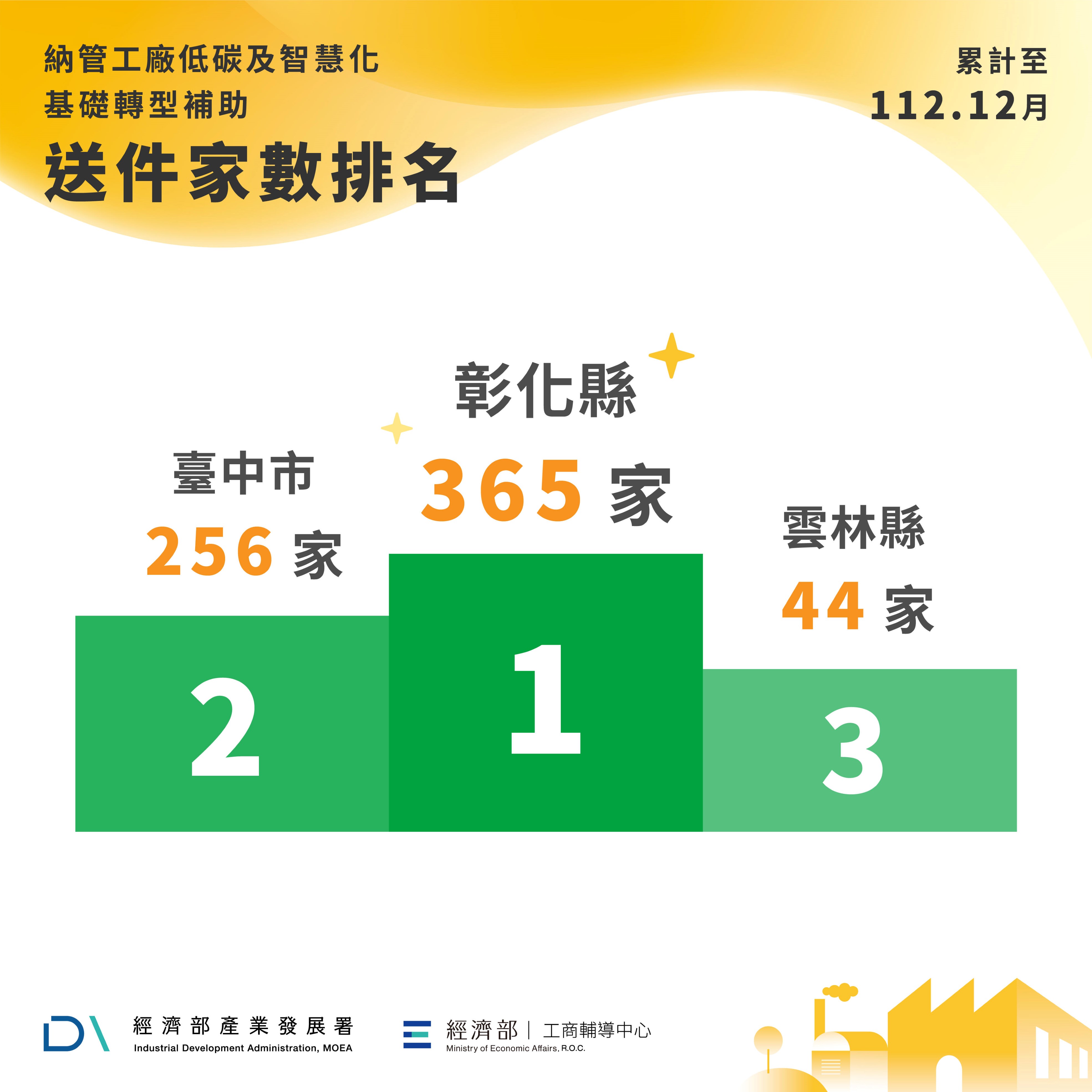 經濟部將持續督導地方政府審查進度,業已研訂「優化工廠改善計畫審核作業工作指引」,提供地方政府精進審核作業效率之參考。另為協助納管工廠導入低碳化、智慧化等技術或設備更新,已核定工廠改善計畫者可提報基礎轉型個案補助計畫向本部申請最高上限150萬元經費補助。截至112年12月,各直轄市、縣(市)業者送件情形如表三,以彰化縣最多365家、其次臺中市256家、再次雲林縣44家。考量該計畫經費有限,請地方政府加速審查速度,讓業者落實工廠環保及消防等設施改善,早日取得合法工廠資格。