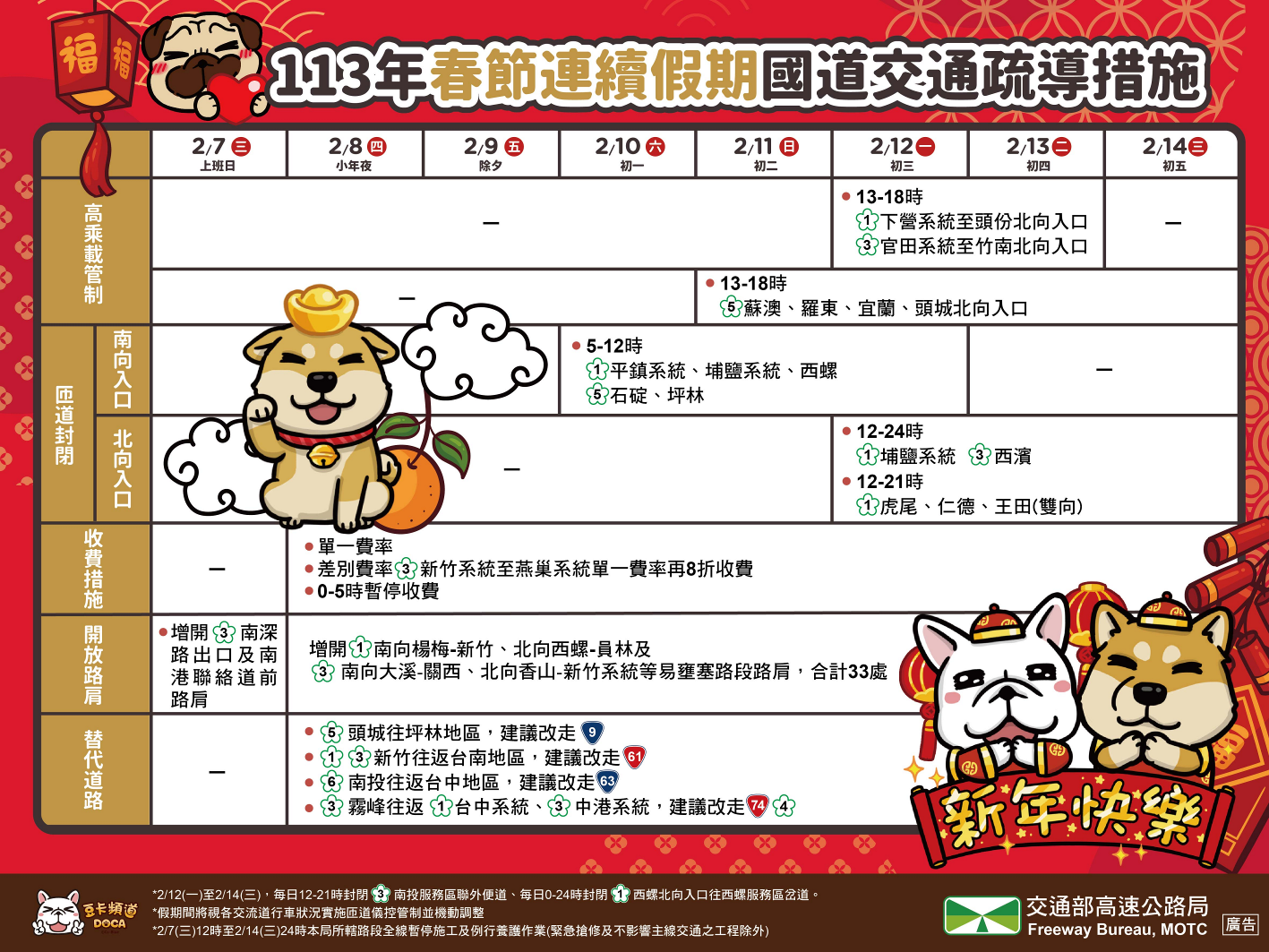 今年春節連假各項交通疏運(導)規劃如下: