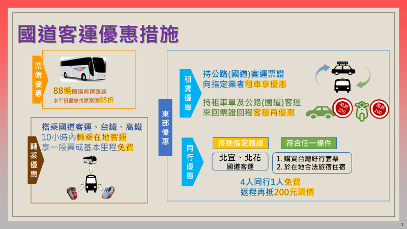 (一)為鼓勵民眾搭乘國道客運,連假期間提供國道客運票價及轉乘優惠(如:88條國道客運路線享平日優惠或原票價85折、以及10小時內轉乘在地客運享一段票或基本里程免費);另搭乘國道客運前往東部再加碼票價(在指定日期4人同行1人免費,返程再抵200元)或租車優惠(持國道客運購票證明租車再享優惠)。(優惠措施詳如圖3)